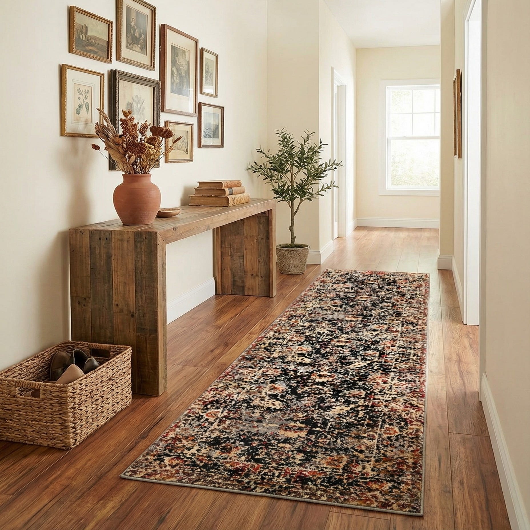 Primary color is Black. Colors in this rug include: Black, Beige, Brown, Gray, Tan, Red.