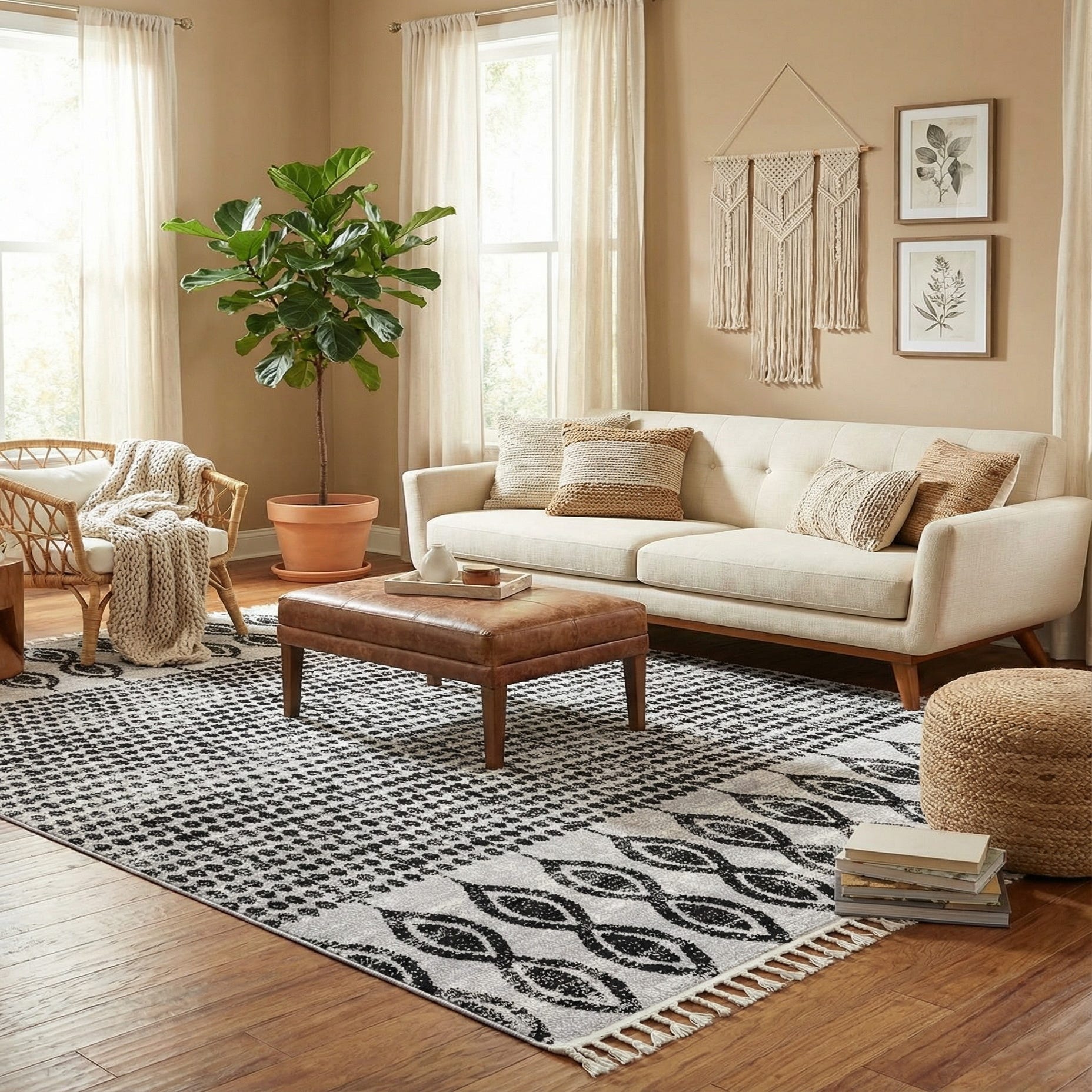 Primary color is Black. Colors in this rug include: Black, Gray, Ivory.