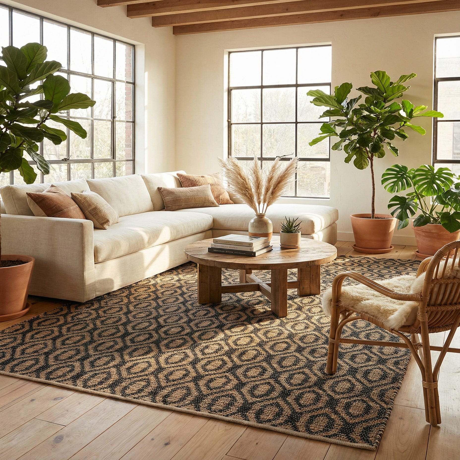 Primary color is Black. Colors in this rug include: Black, Natural.