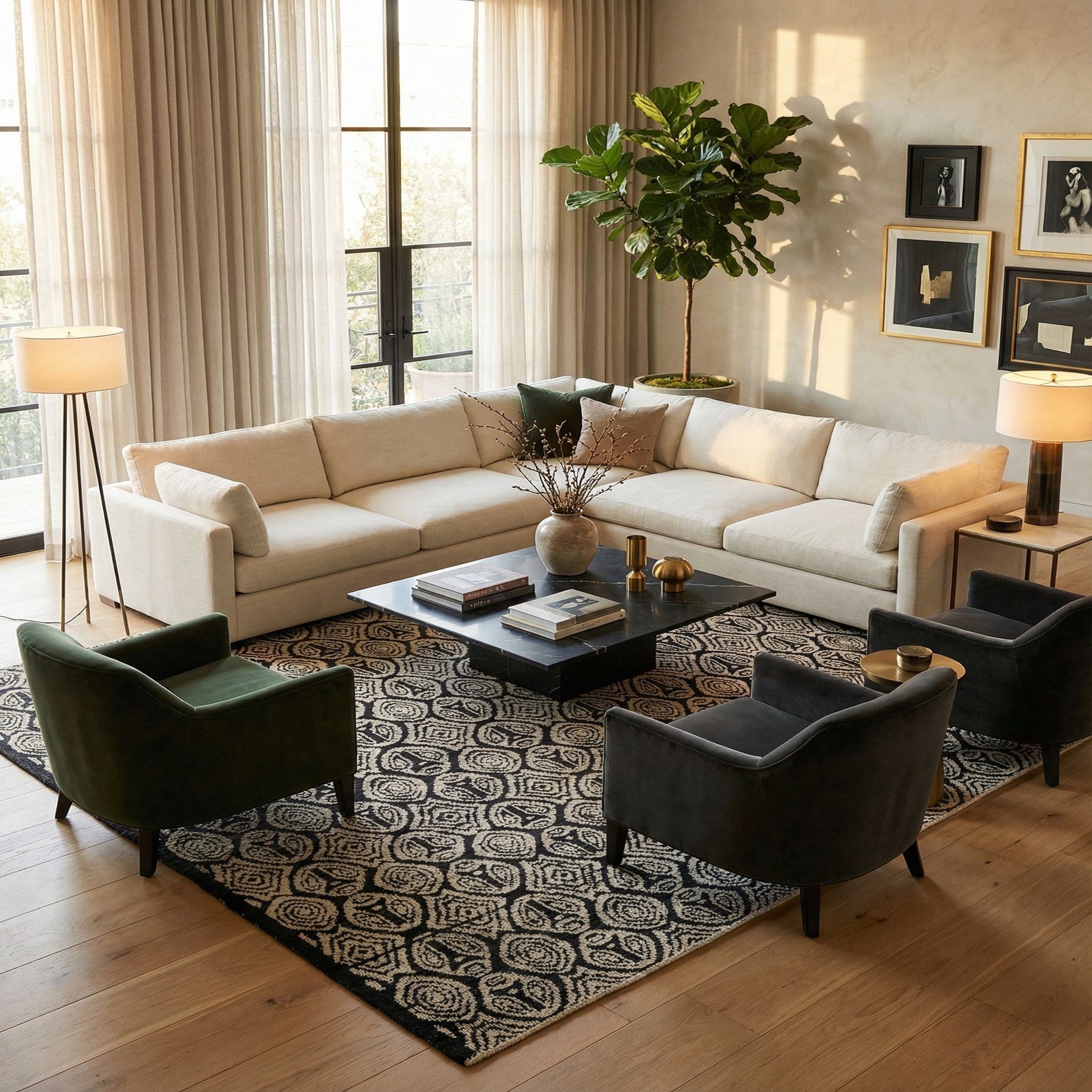 Primary color is Black. Colors in this rug include: Black, Ivory.