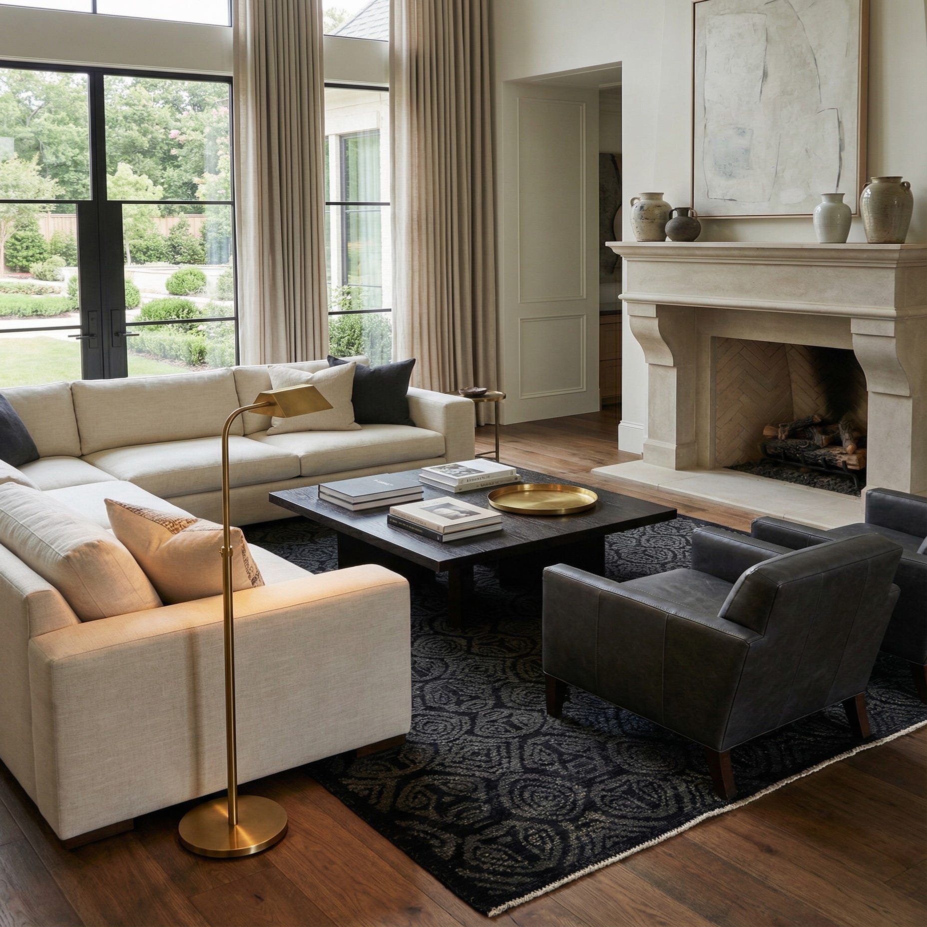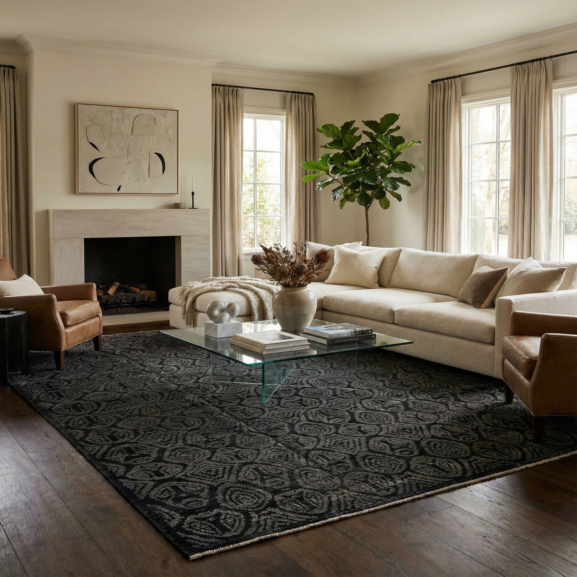 Primary color is Black. Colors in this rug include: Black, Gray, Ivory.