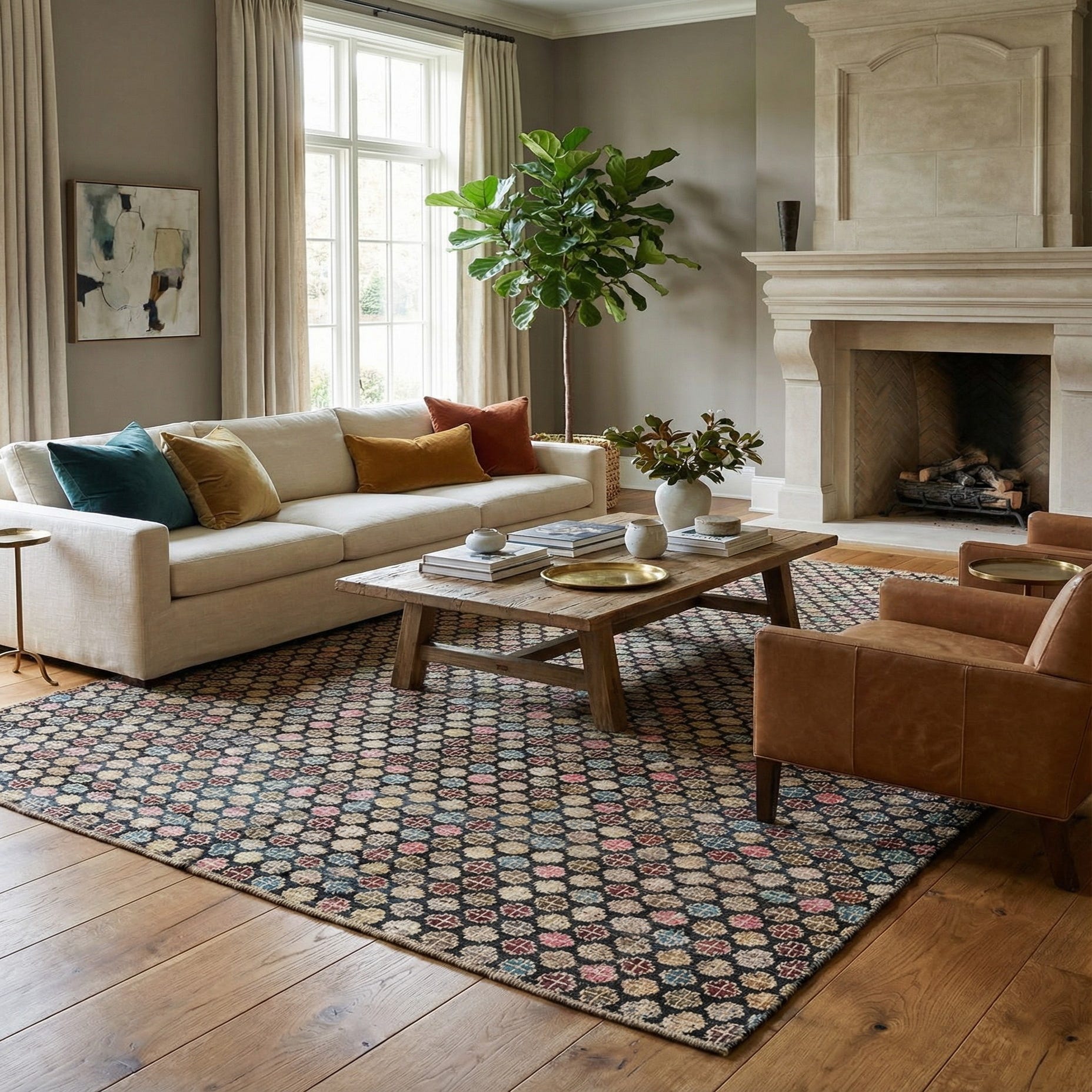 Primary color is Black. Colors in this rug include: Black, Beige, Blue, Brown, Burgundy, Red, Purple, Pink, Turquoise, Yellow, Violet, Navy Blue, Light Blue, Light Brown, Light Green, Light Salmon, Gold, Gray, Green.