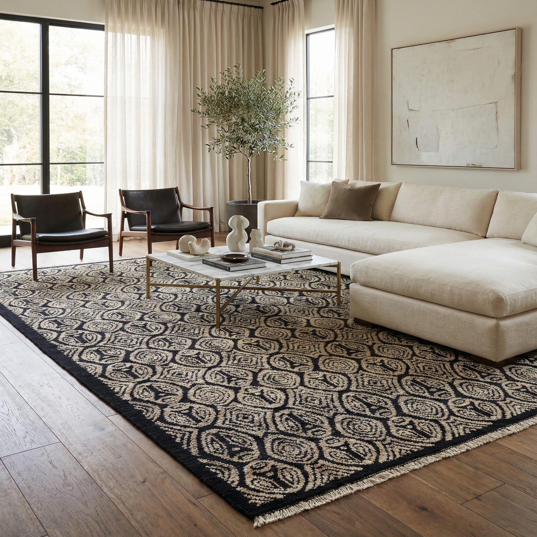Primary color is Black. Colors in this rug include: Black, Ivory.
