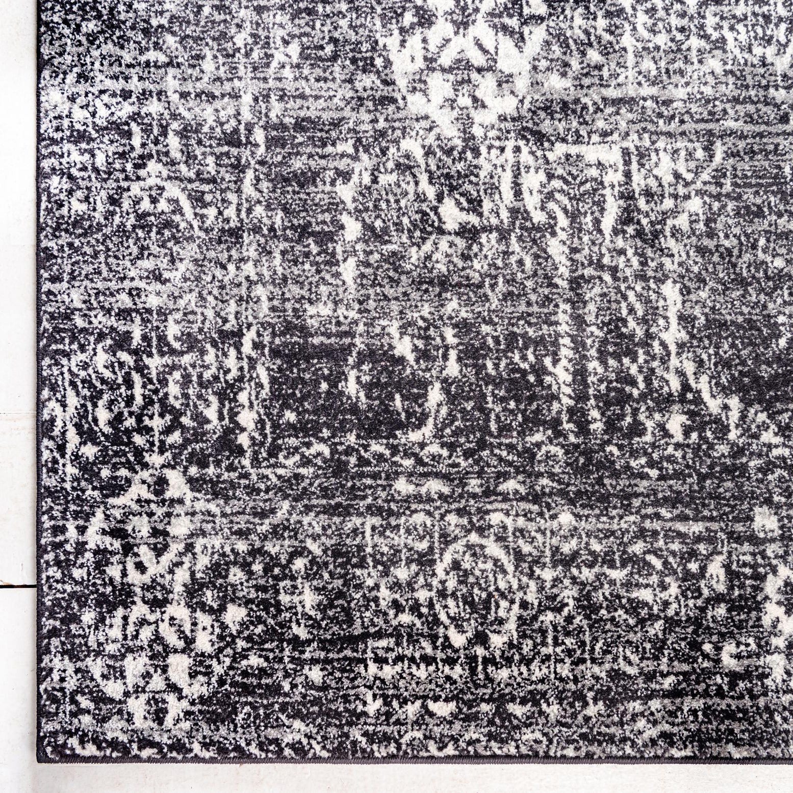 Primary color is Black. Colors in this rug include: Black, Gray, Ivory.