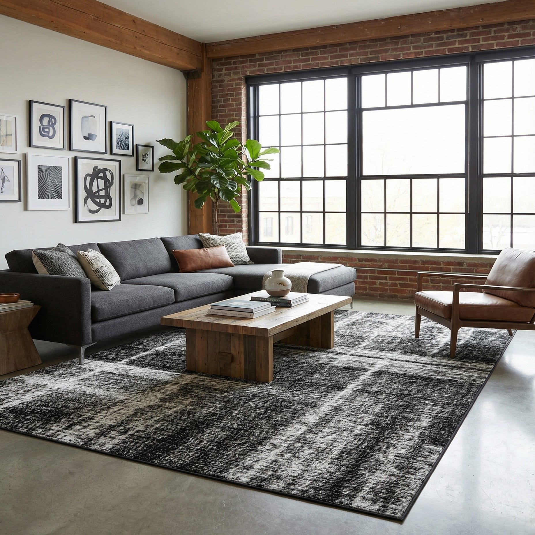Primary color is Black. Colors in this rug include: Black, Gray, Ivory.