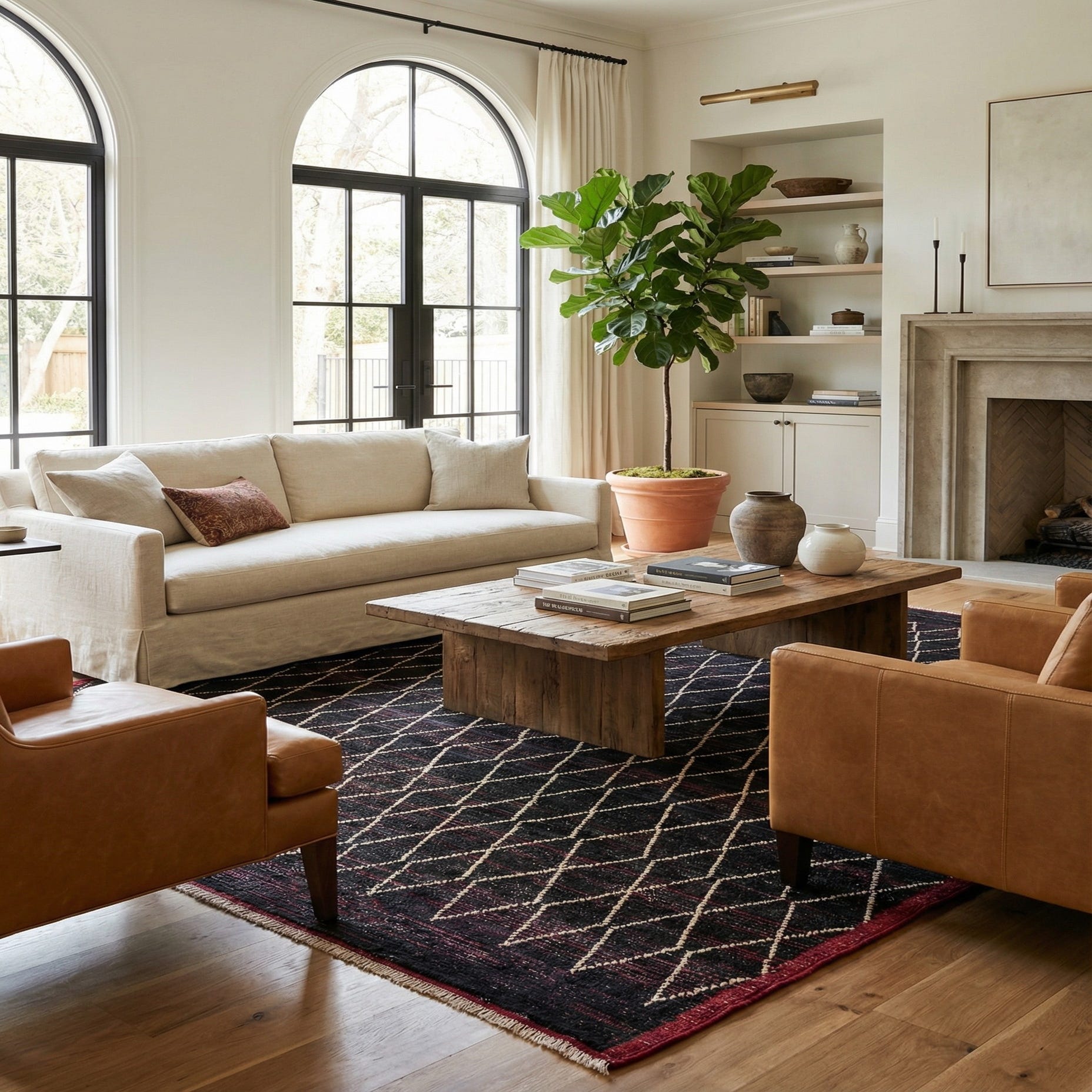 Primary color is Black. Colors in this rug include: Black, Ivory, Burgundy.