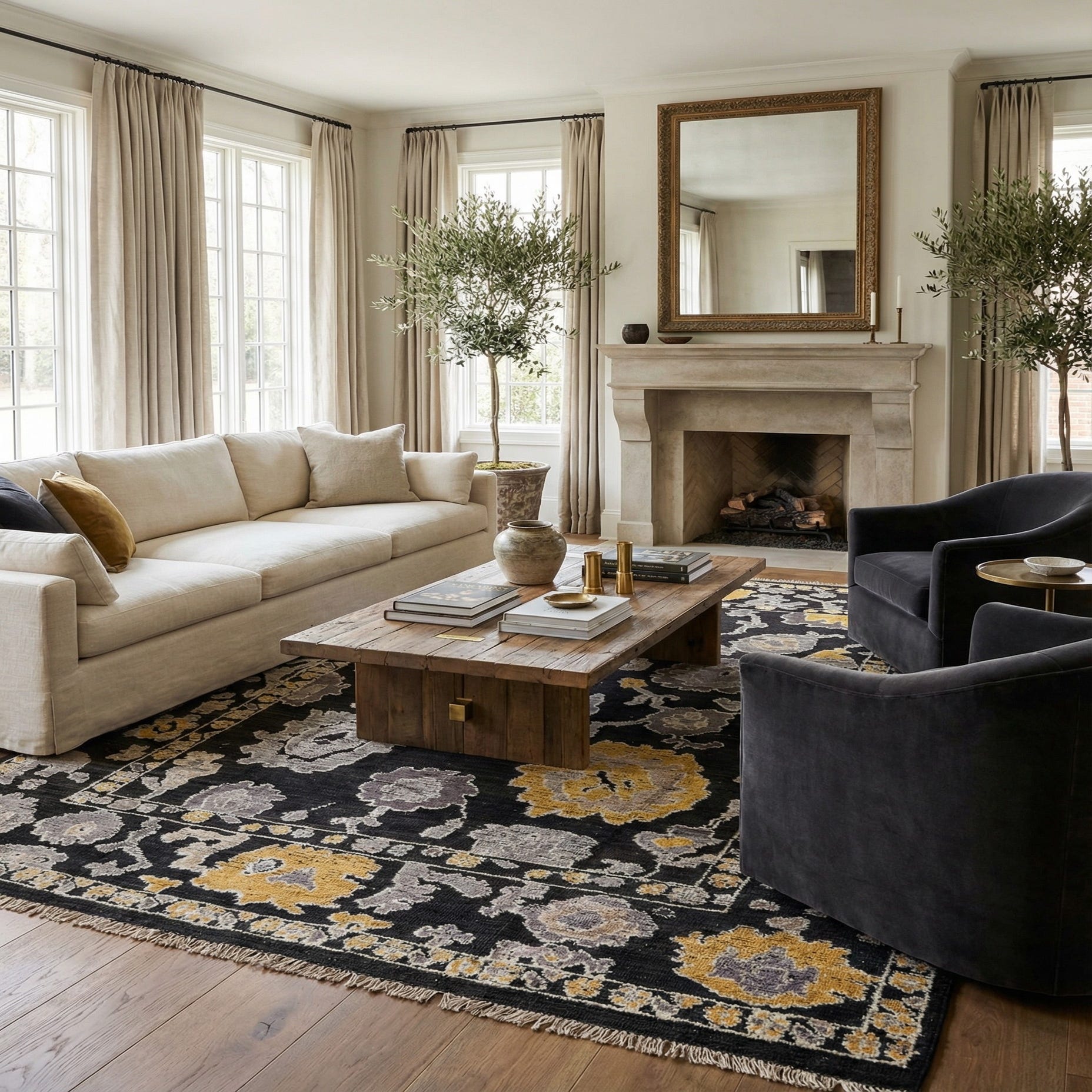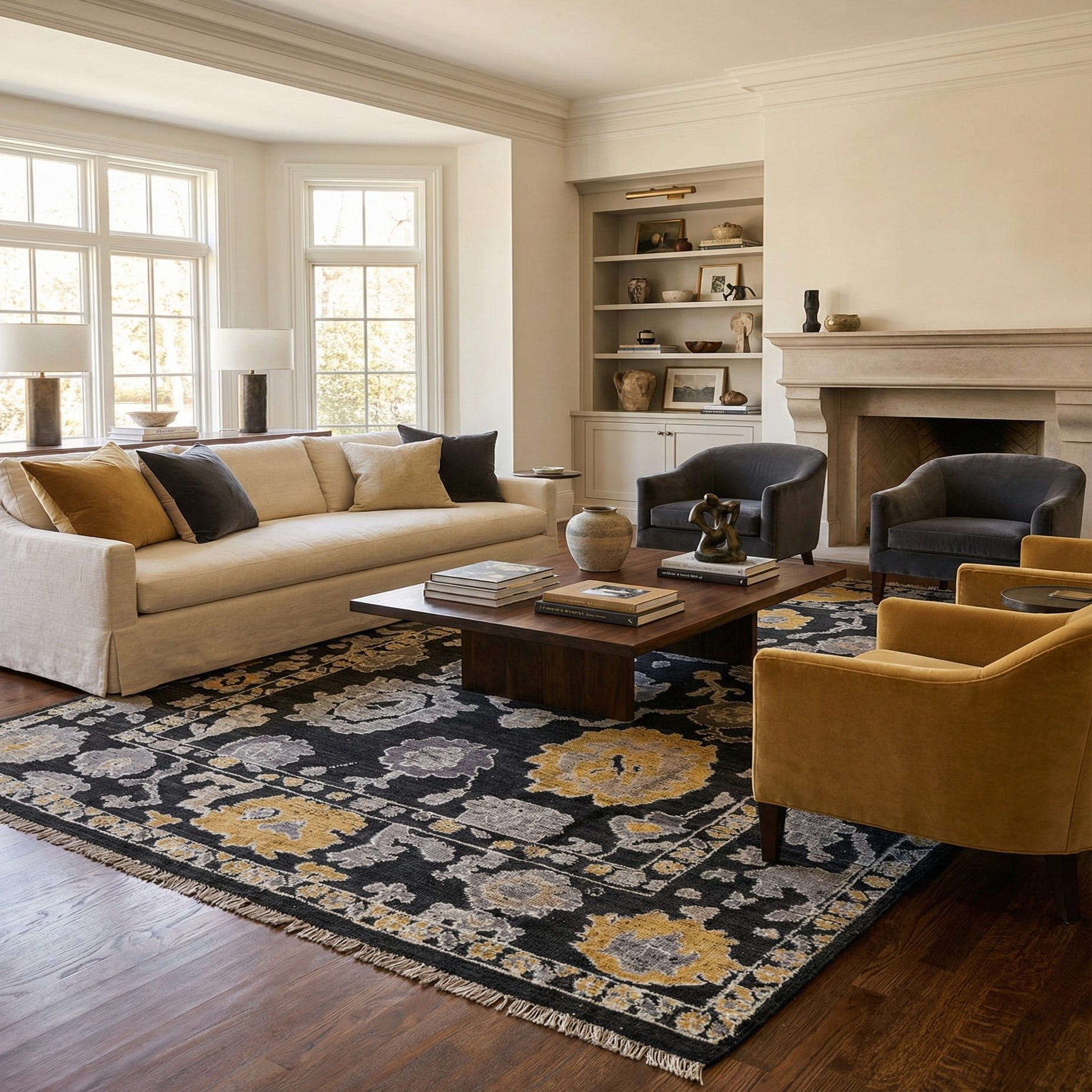 Primary color is Black. Colors in this rug include: Black, Gray, Ivory, Yellow.