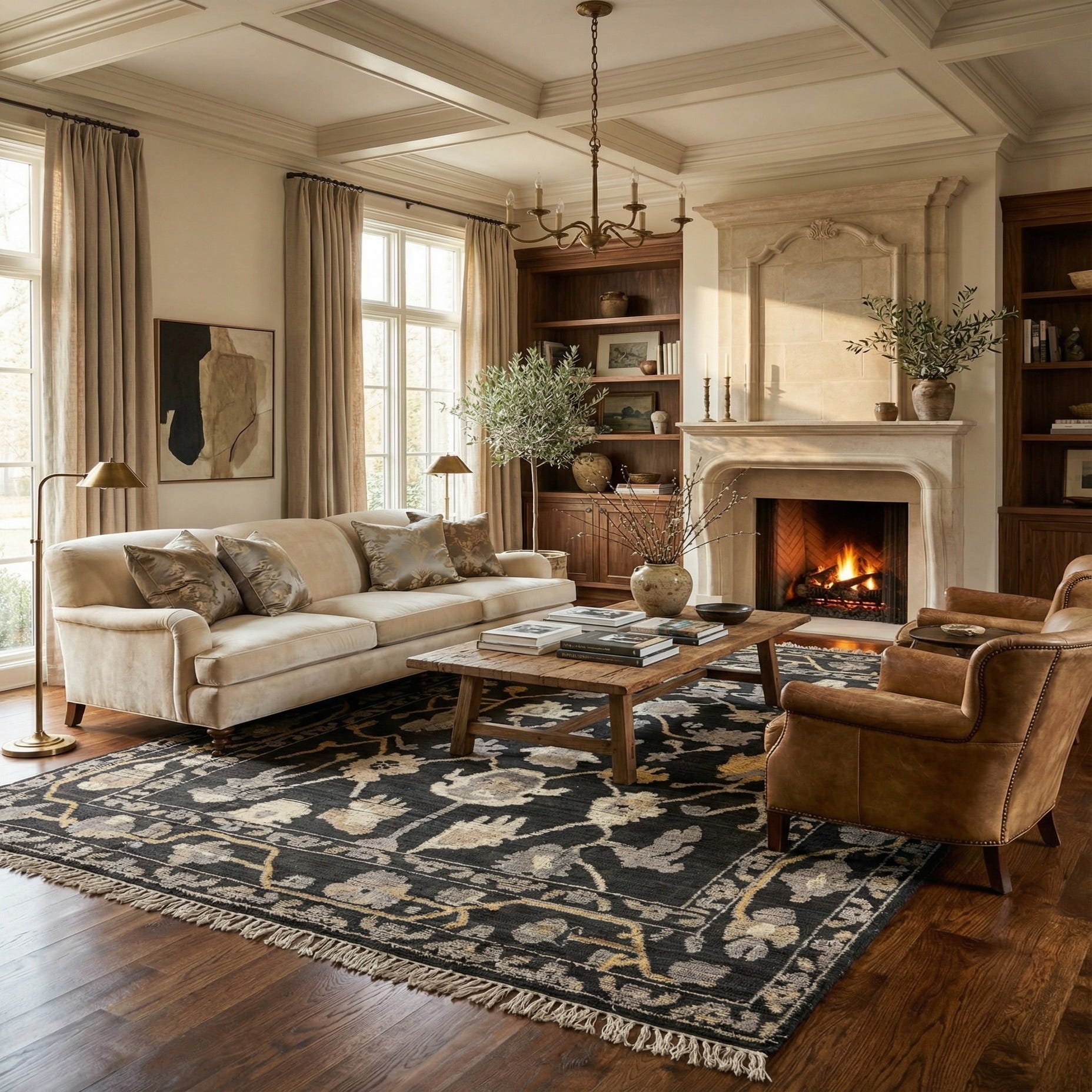 Primary color is Black. Colors in this rug include: Black, Brown, Light Brown, Yellow, Ivory.