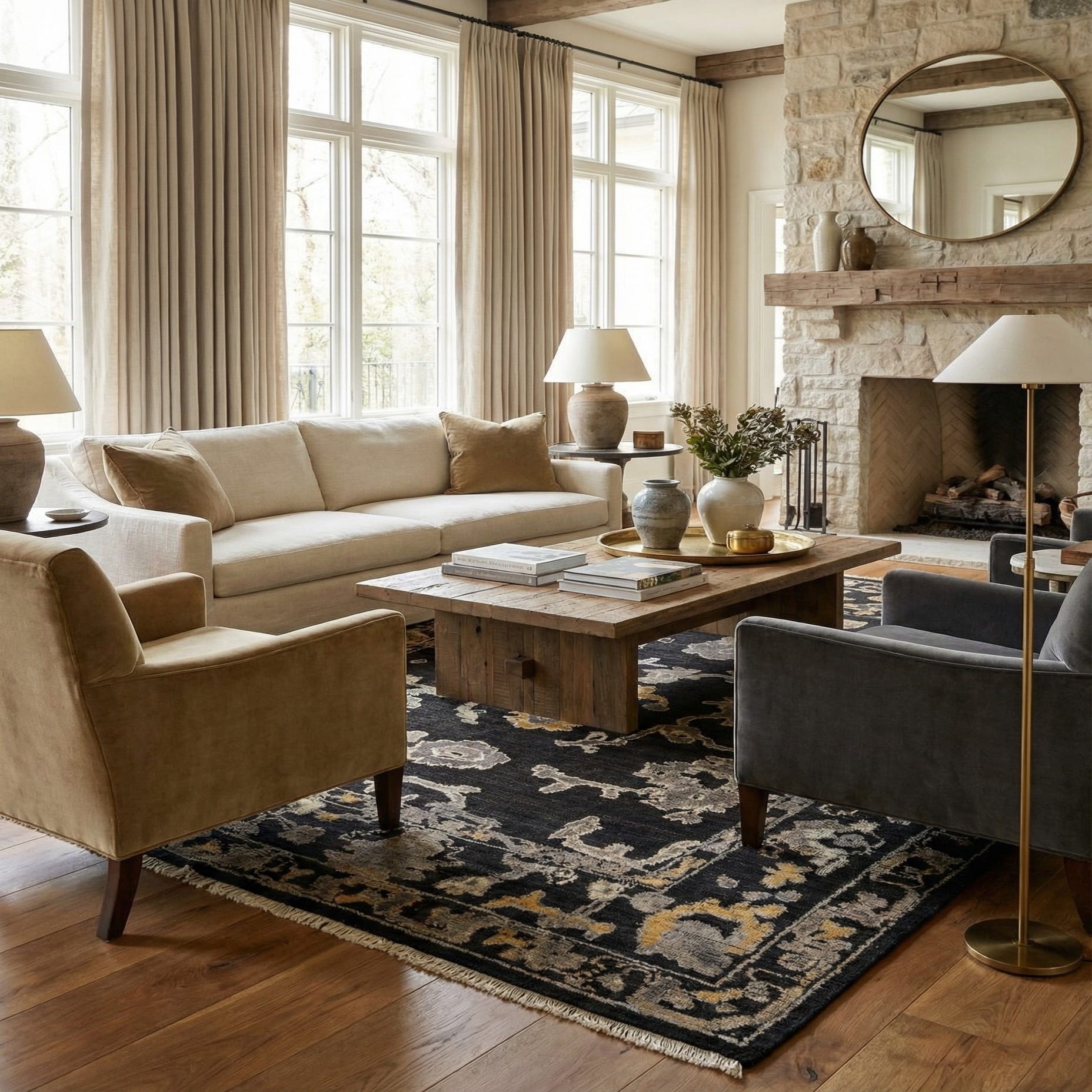 Primary color is Black. Colors in this rug include: Black, Gray, Ivory, Yellow, Light Brown.