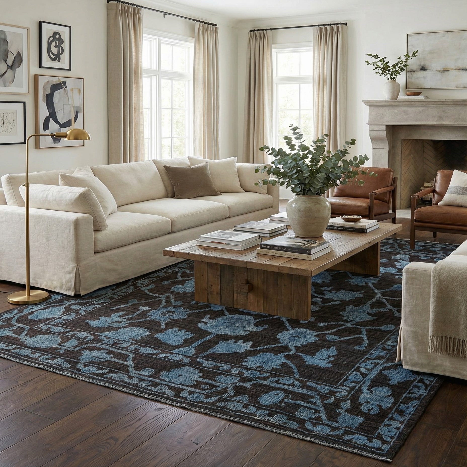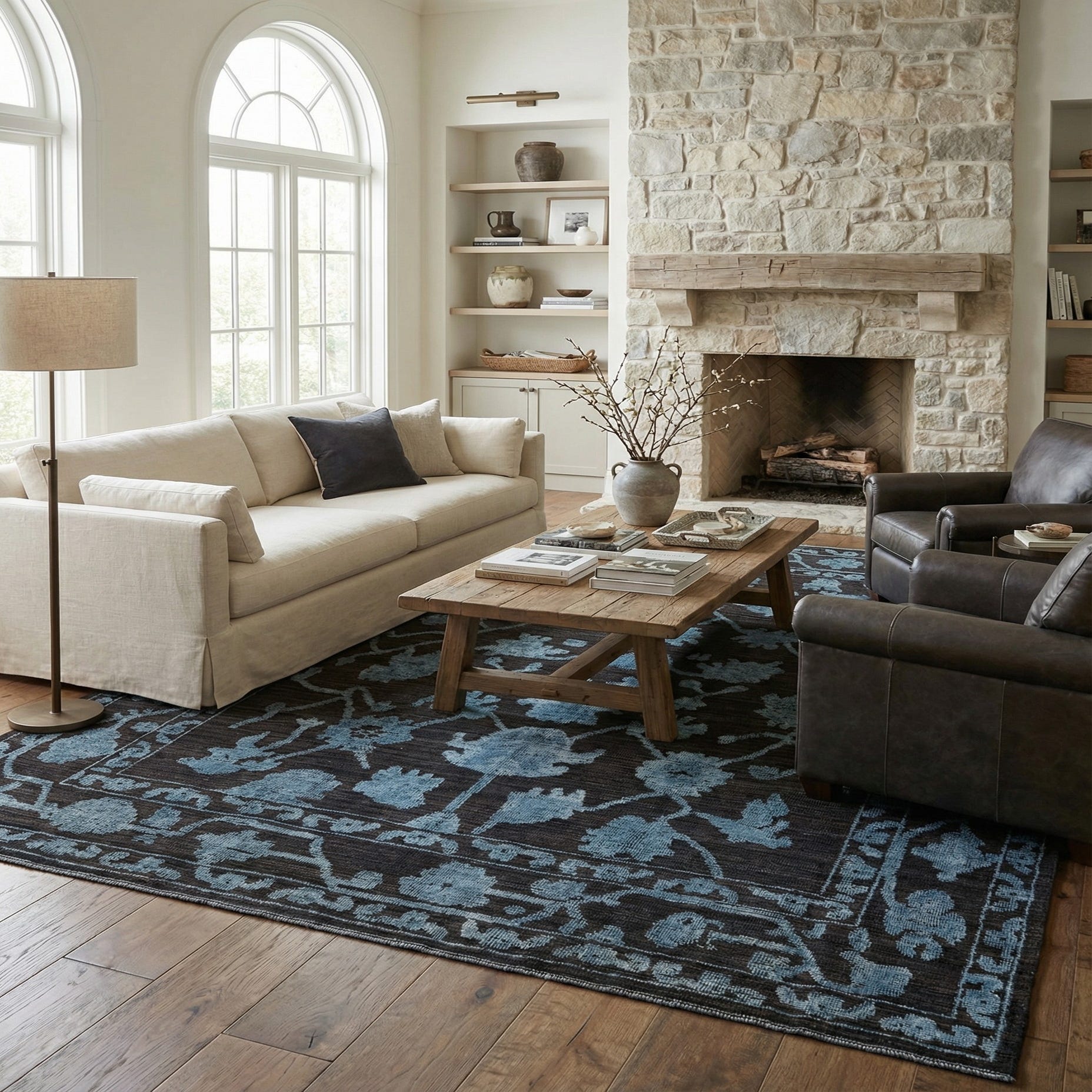 Primary color is Black. Colors in this rug include: Black, Blue.