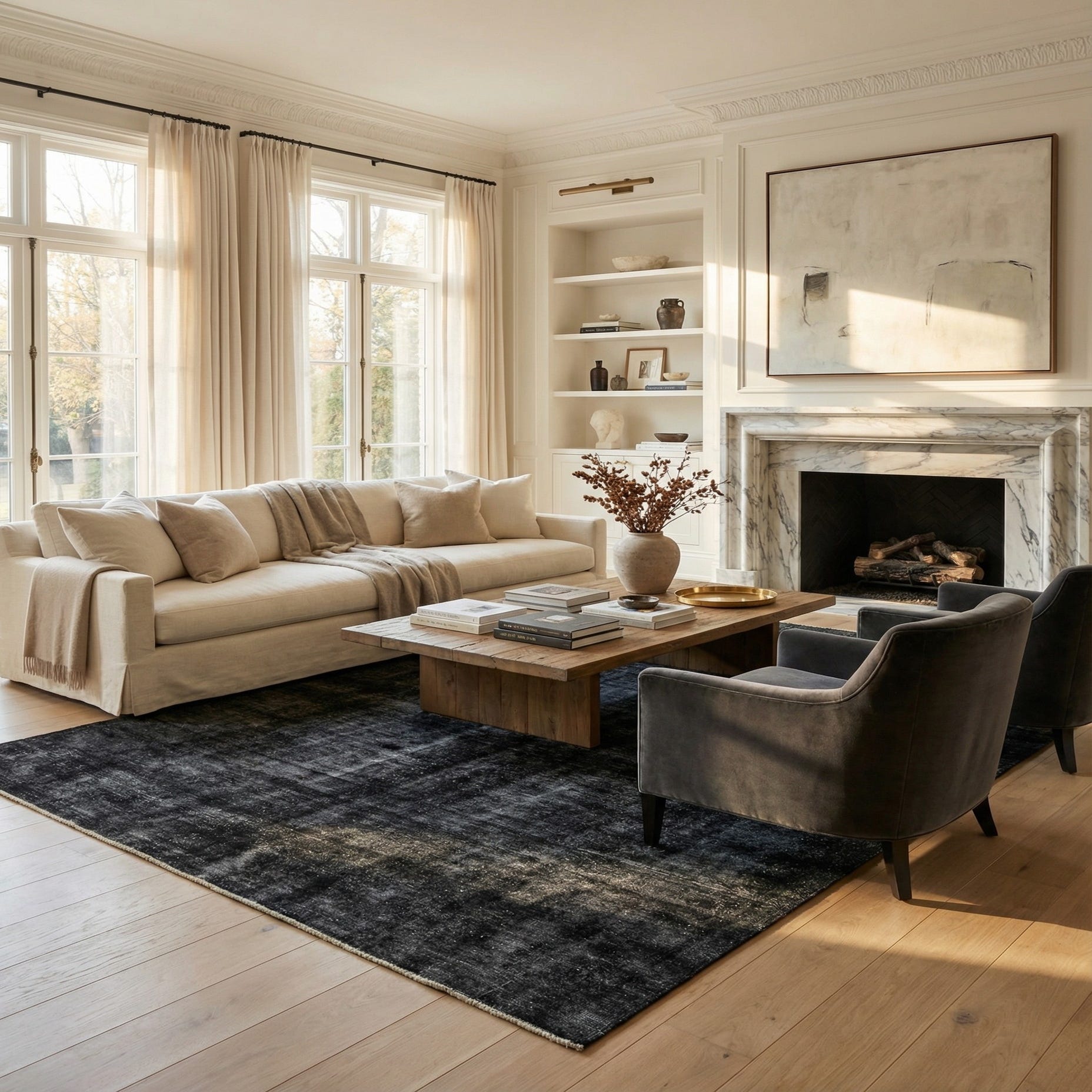 Primary color is Black. Colors in this rug include: Black, Ivory.