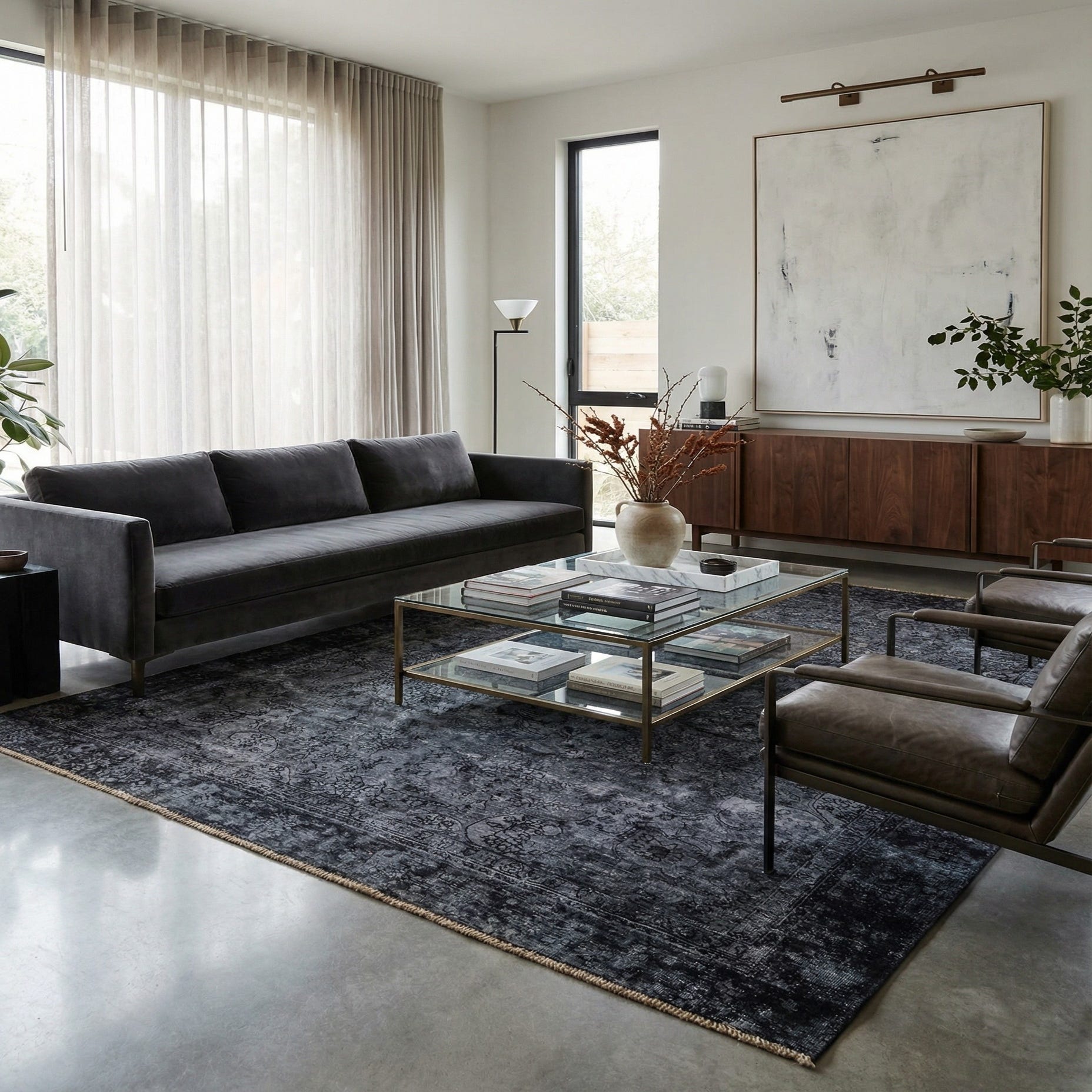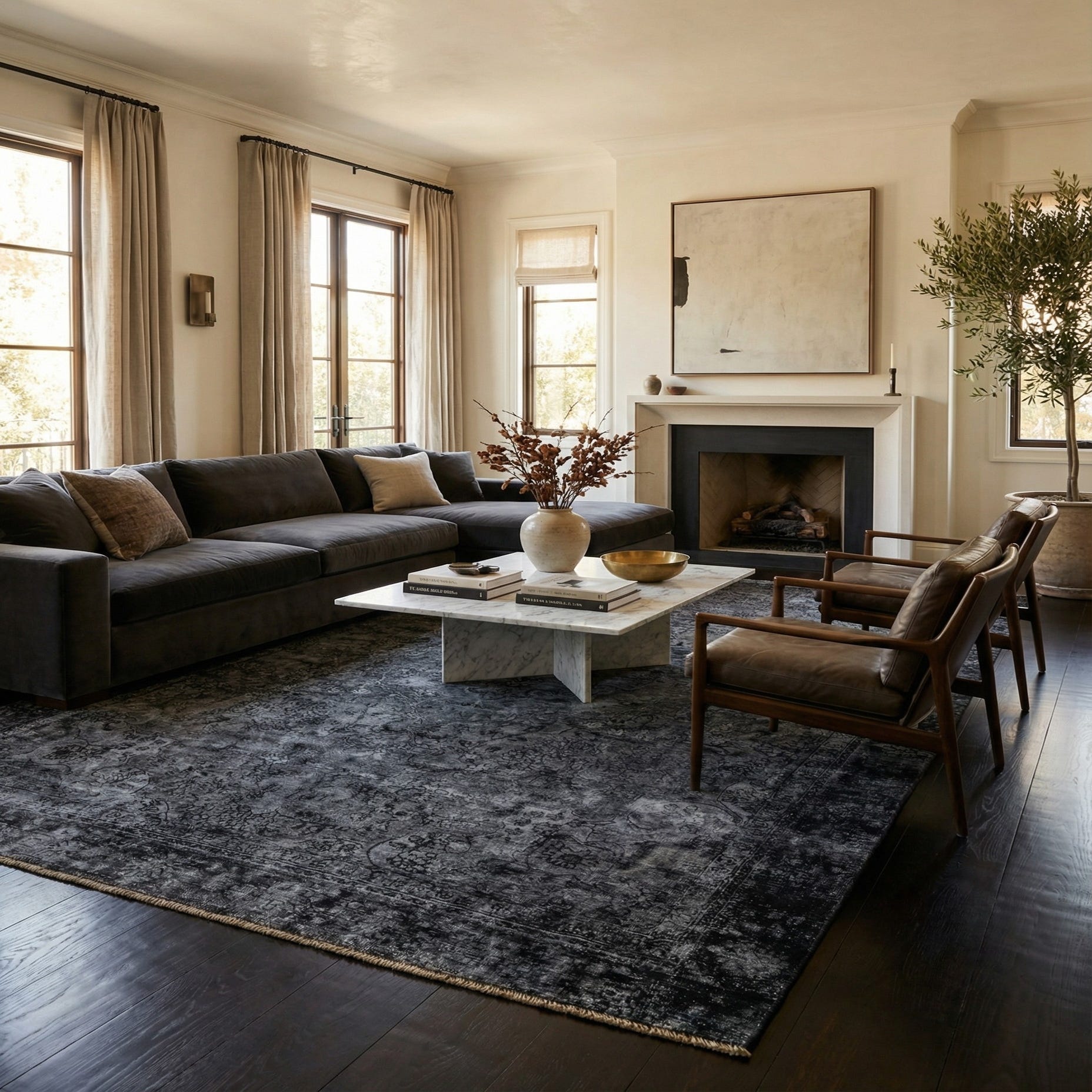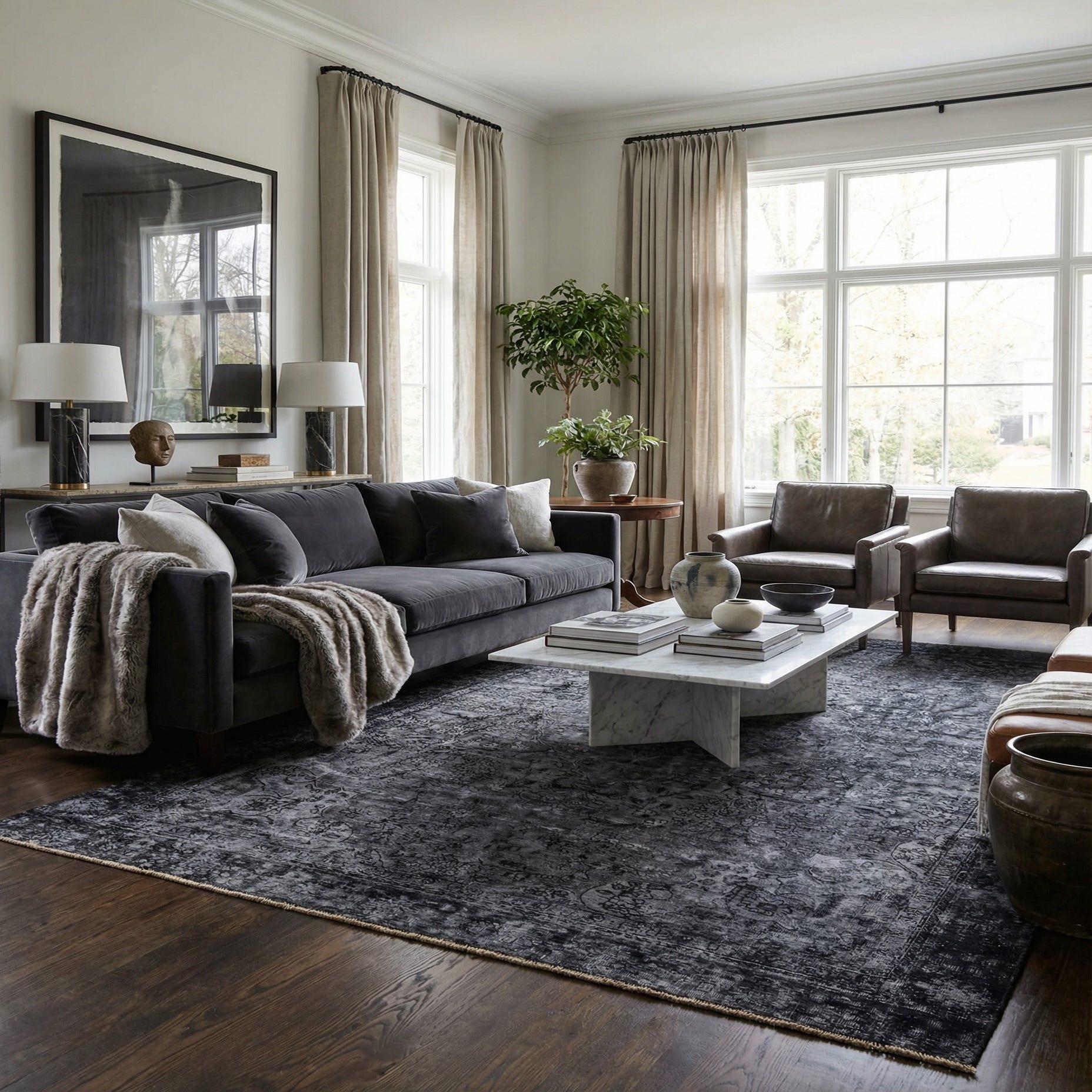 Primary color is Black. Colors in this rug include: Black, Gray.