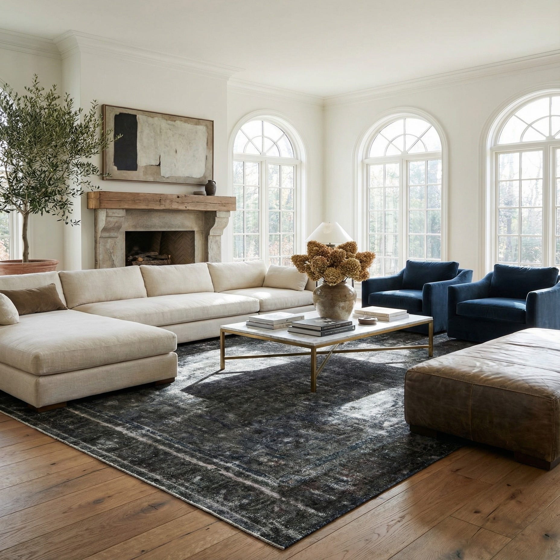 Primary color is Black. Colors in this rug include: Black, Navy Blue, Ivory.