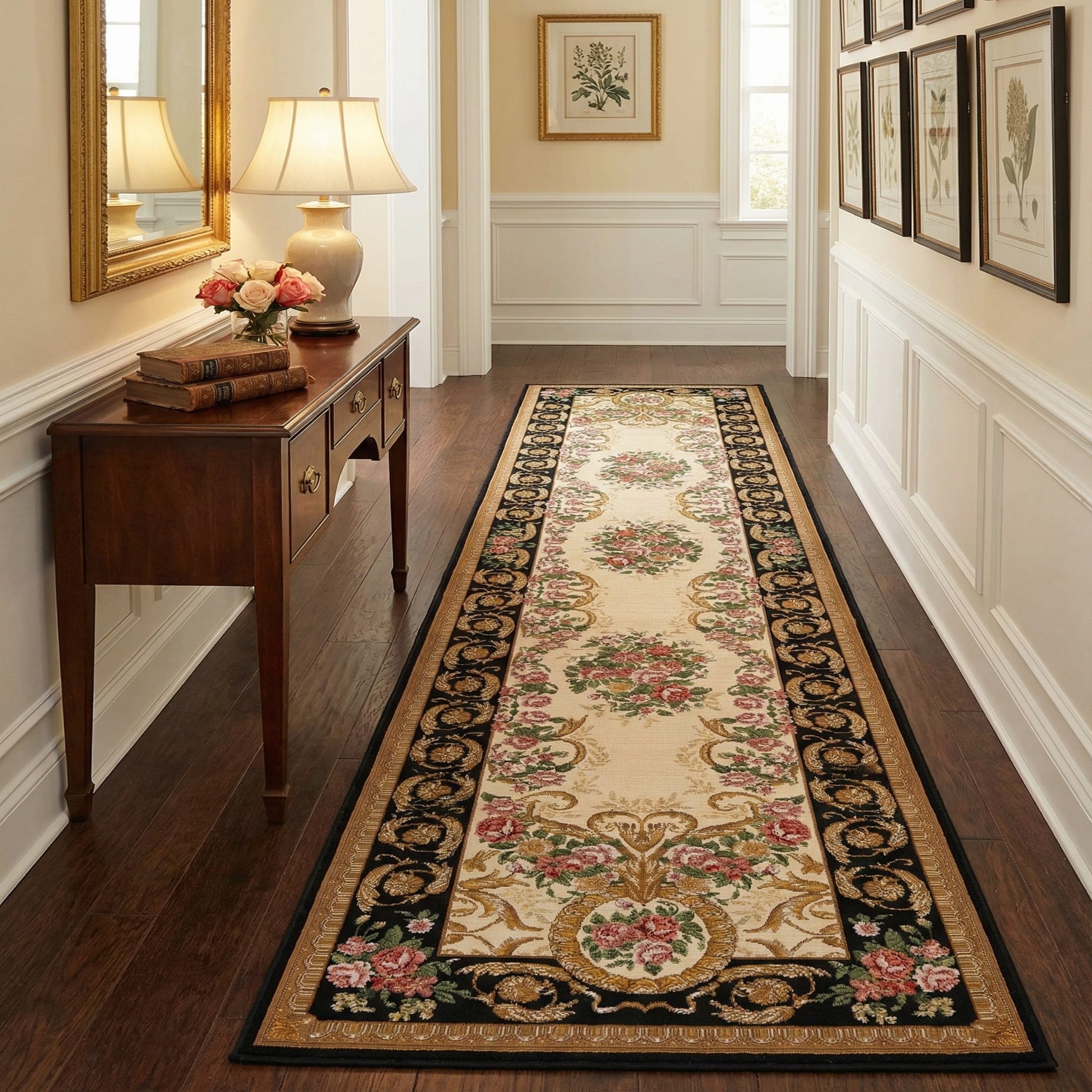 Primary color is Black and Ivory. Colors in this rug include: Black and Ivory, Brown, Green, Red, Pink, Gold, Ivory.
