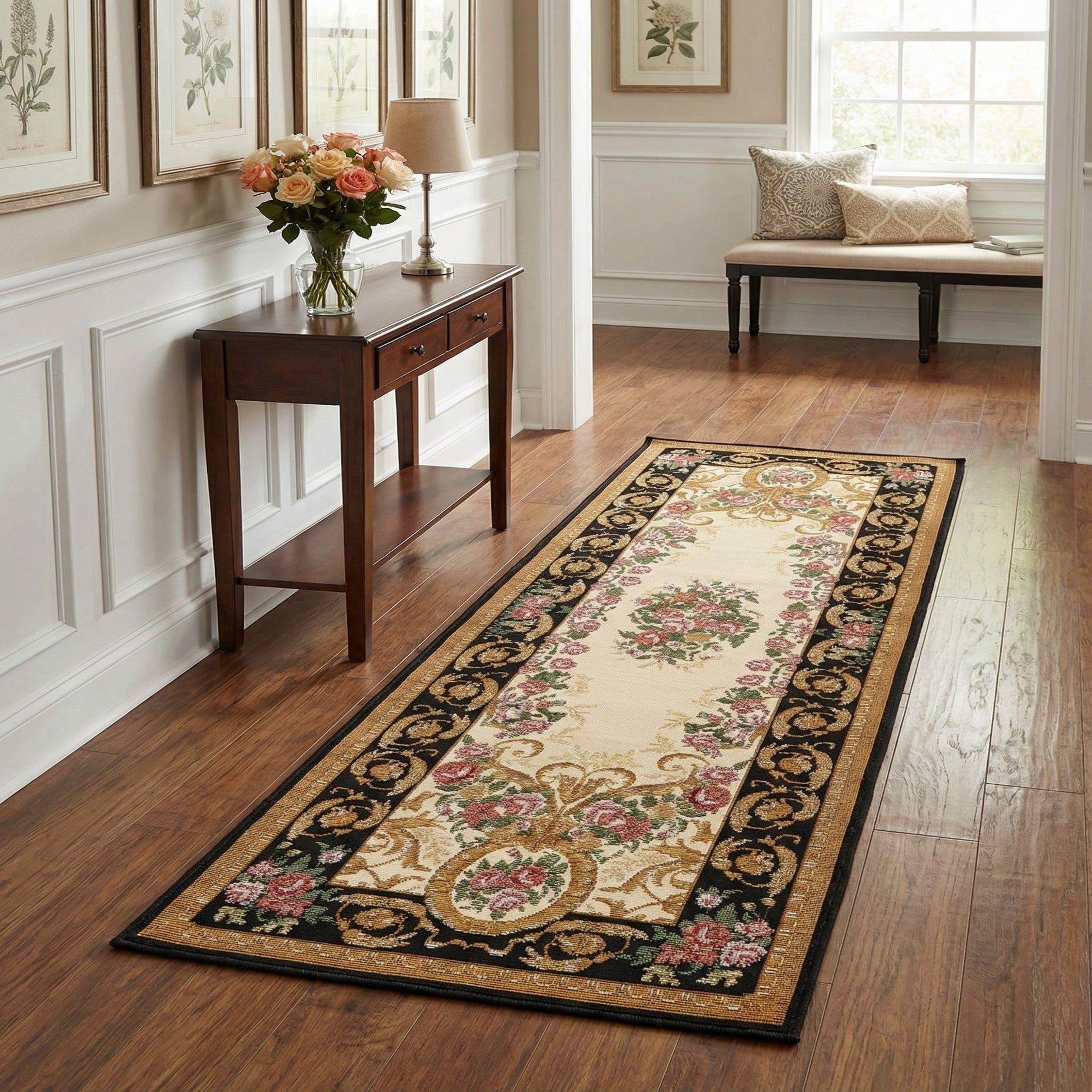 Primary color is Black and Ivory. Colors in this rug include: Black and Ivory, Green, Red, Pink, Brown, Gold.