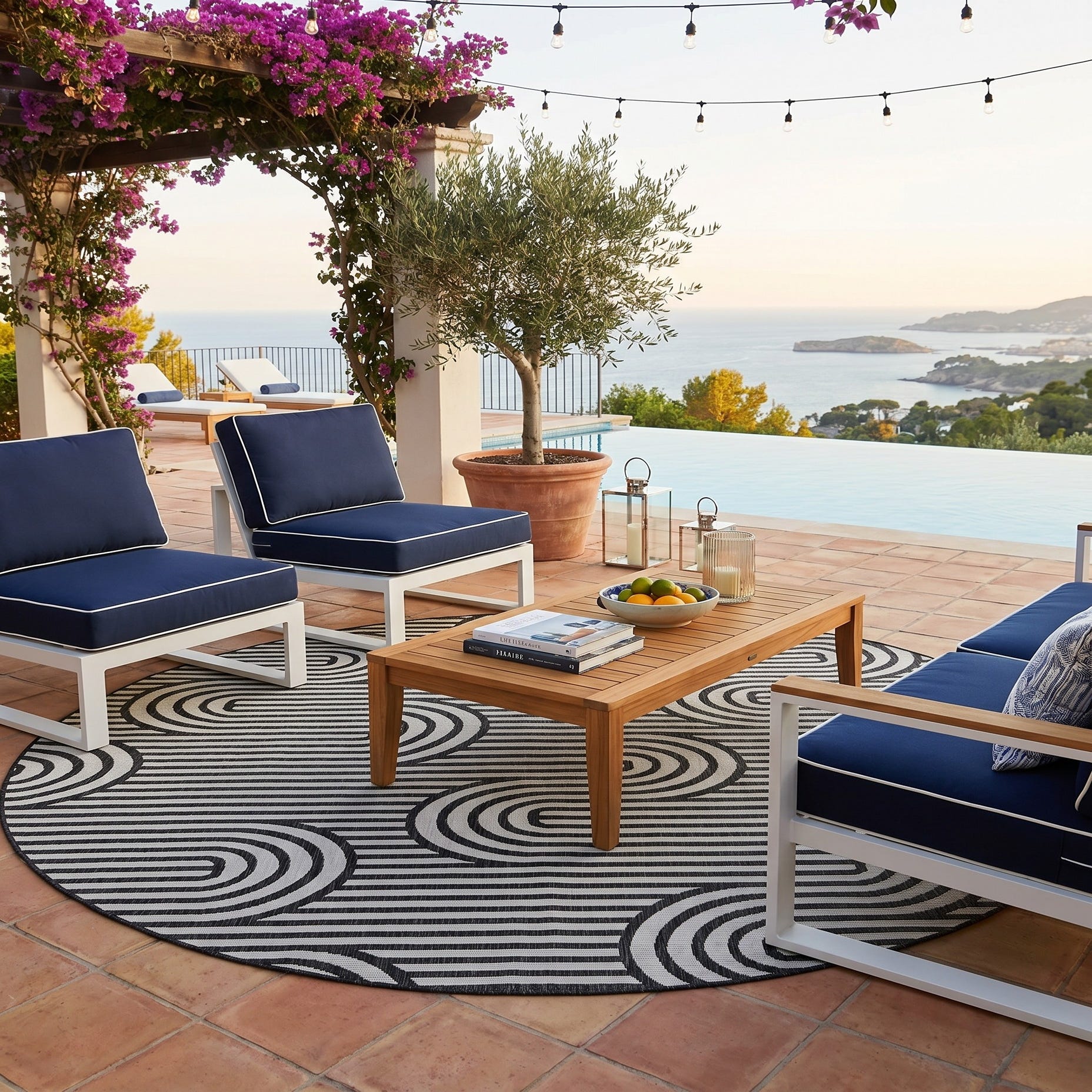 Love the contemporary look of this rug! We are so happy we chose this to accent the blue of our pool with our living area on our lanai. We still are going to add a few more pillows but love the rug to add color.