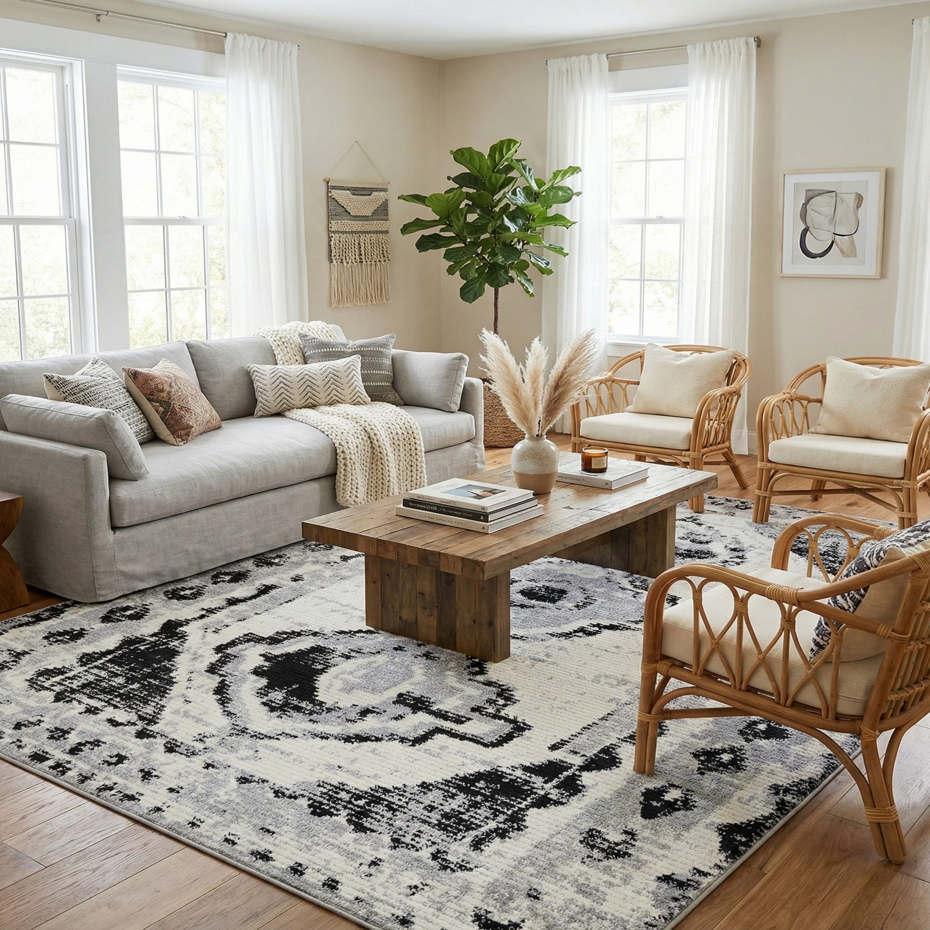 Primary color is Black and White. Colors in this rug include: Black and White, Gray.