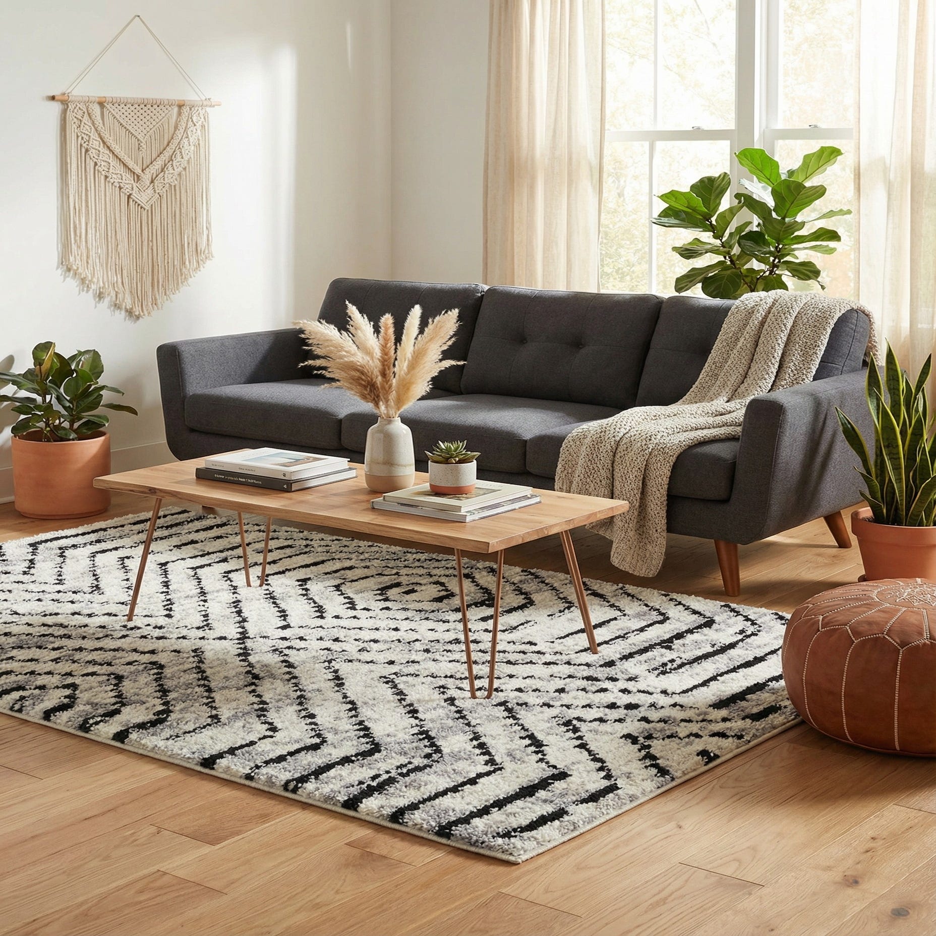 Primary color is Black and White. Colors in this rug include: Black and White, Gray.