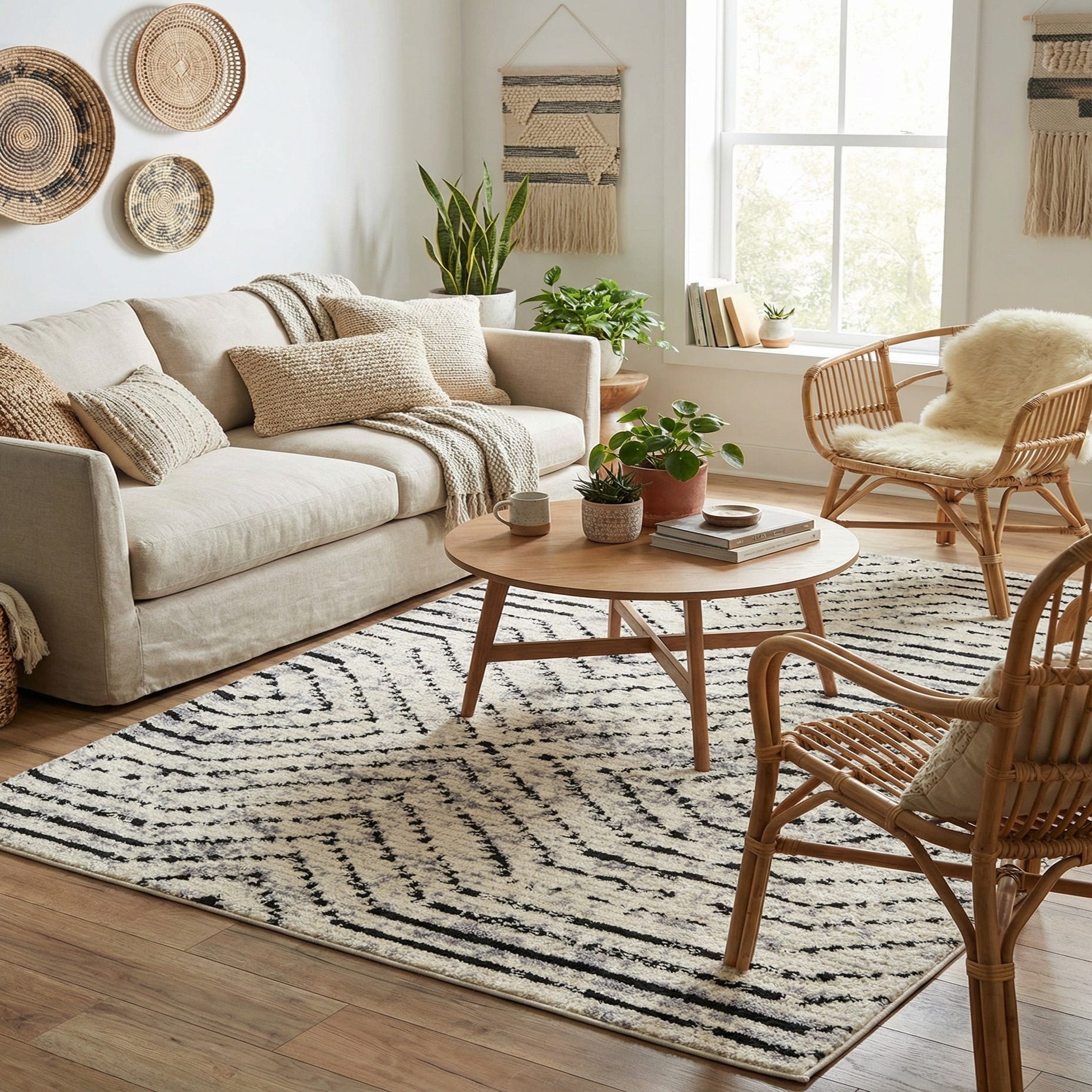Primary color is Black and White. Colors in this rug include: Black and White, Gray.