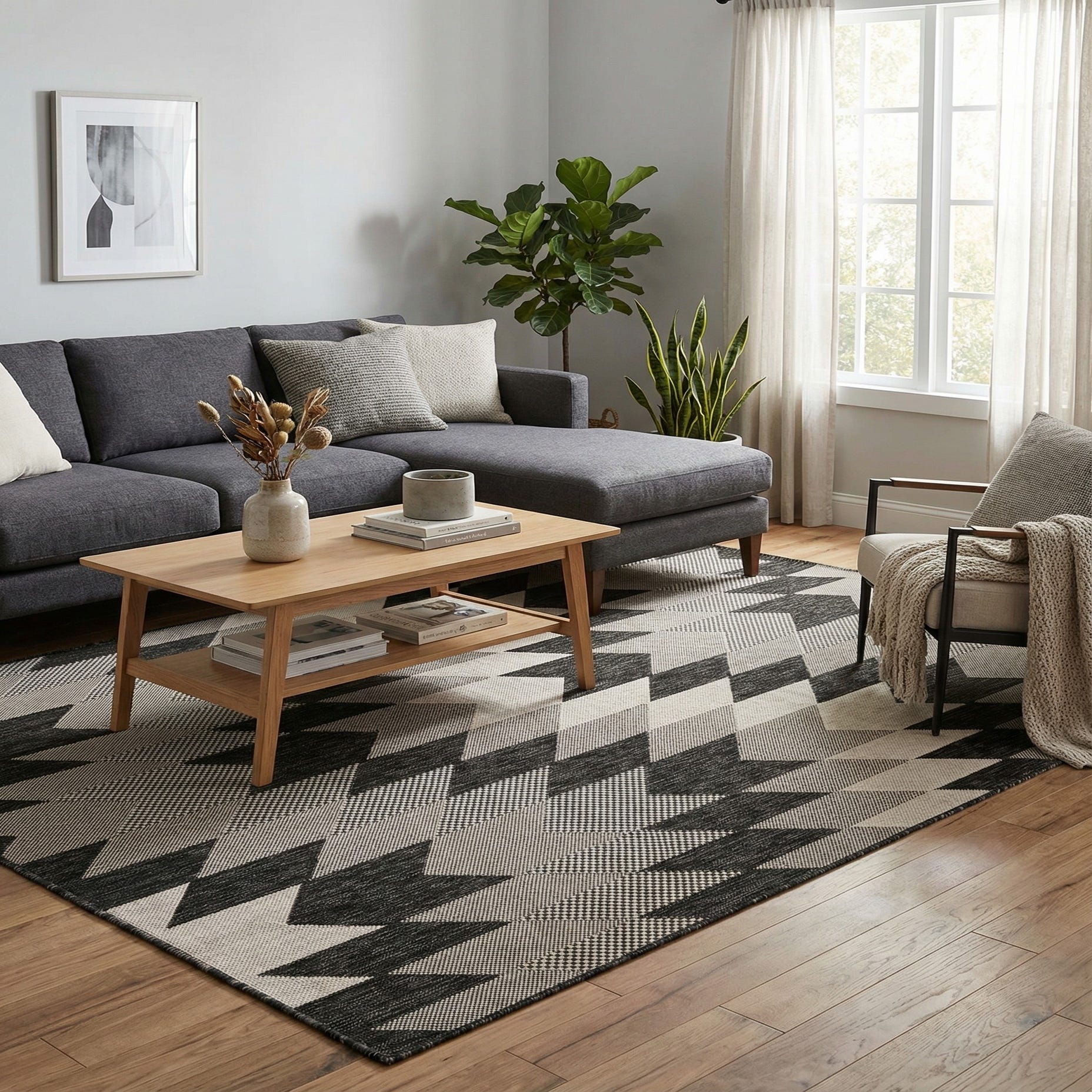 Primary color is Black and White. Colors in this rug include: Black and White, Gray.