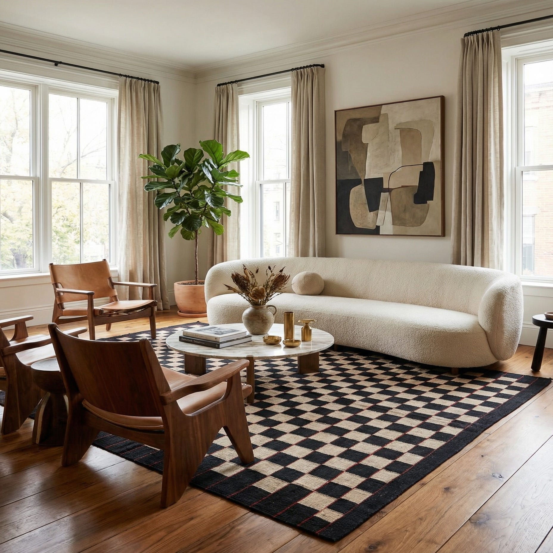Primary color is Black and White. Colors in this rug include: Black and White, Red.