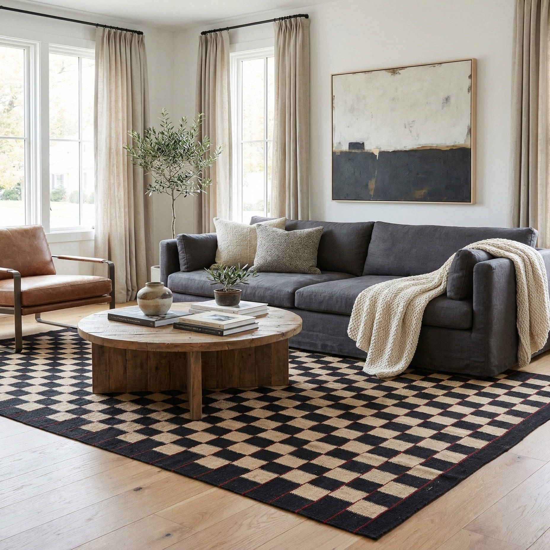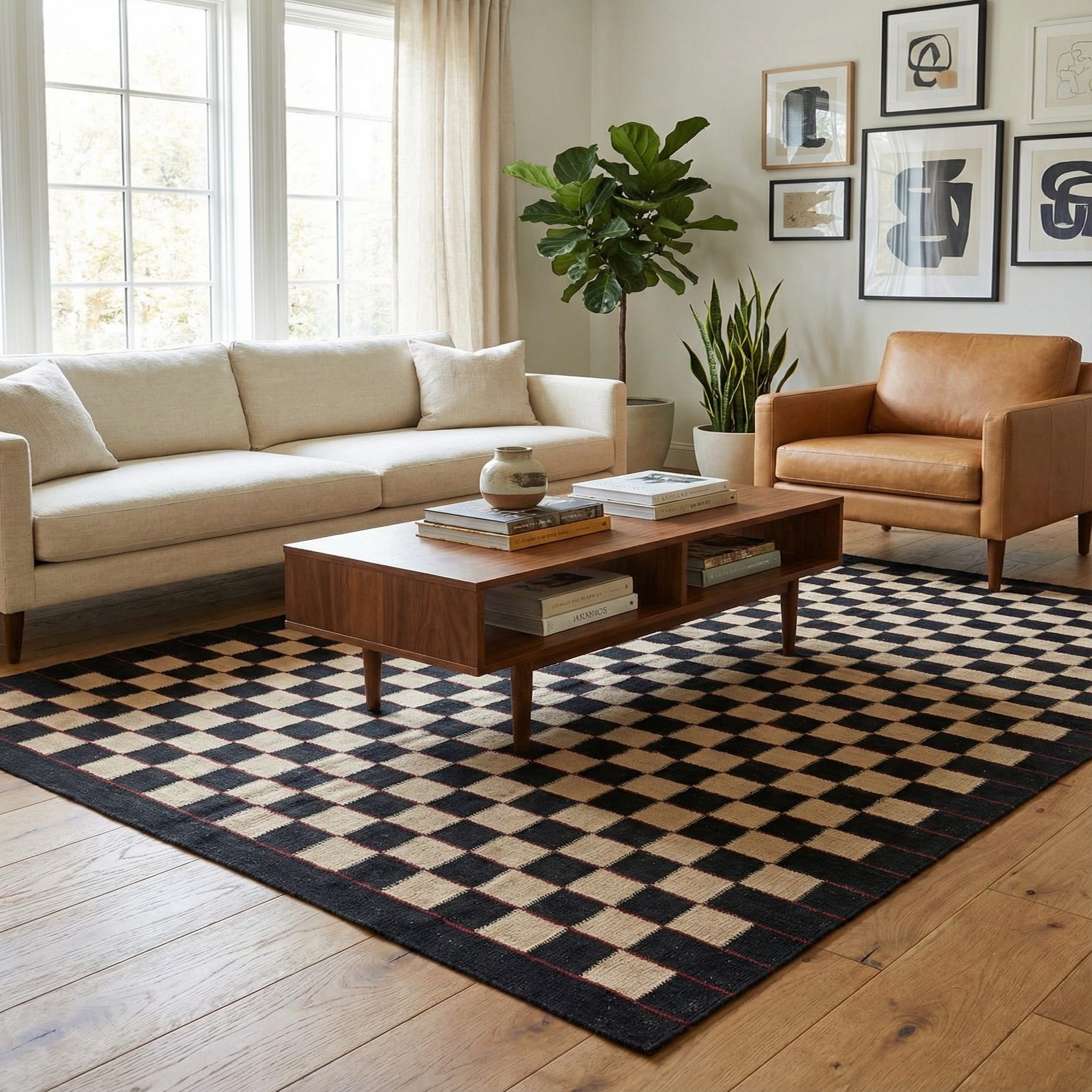 Primary color is Black and White. Colors in this rug include: Black and White, Red.