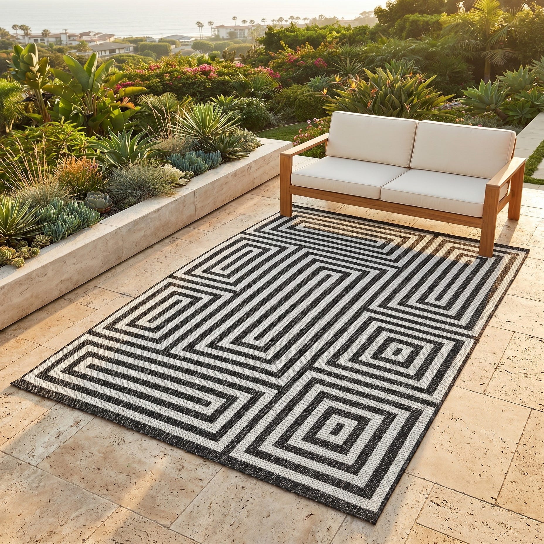 Love the contemporary look of this rug! We are so happy we chose this to accent the blue of our pool with our living area on our lanai. We still are going to add a few more pillows but love the rug to add color.