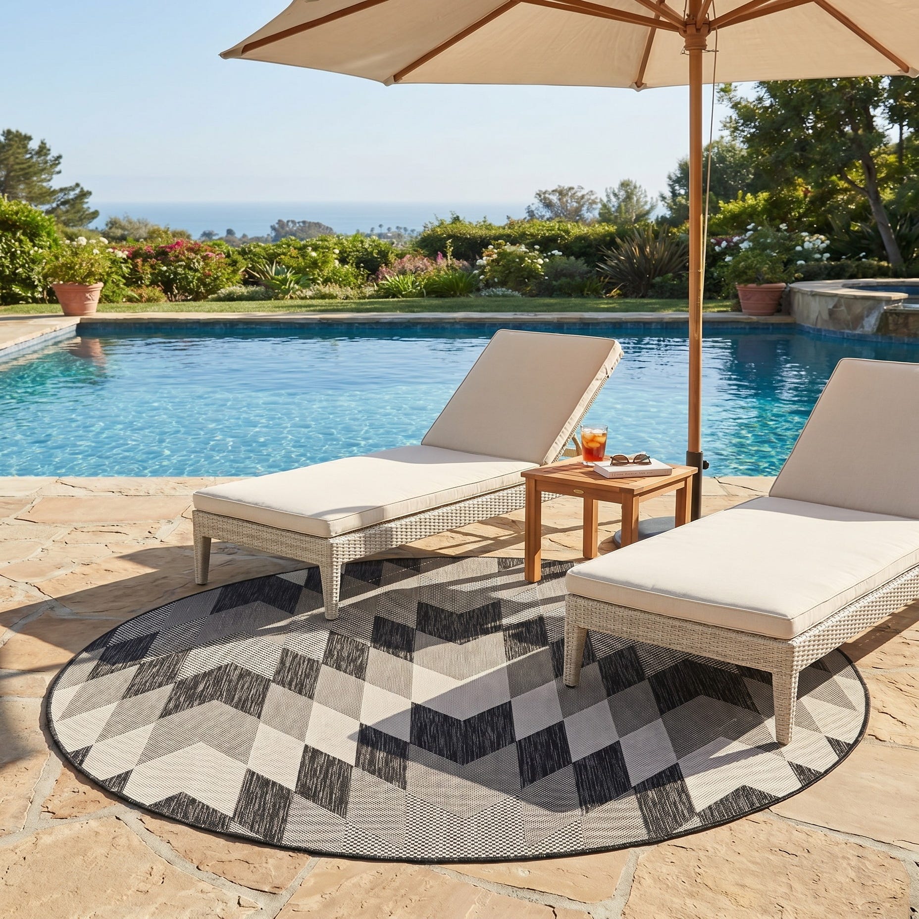 Love the contemporary look of this rug! We are so happy we chose this to accent the blue of our pool with our living area on our lanai. We still are going to add a few more pillows but love the rug to add color.