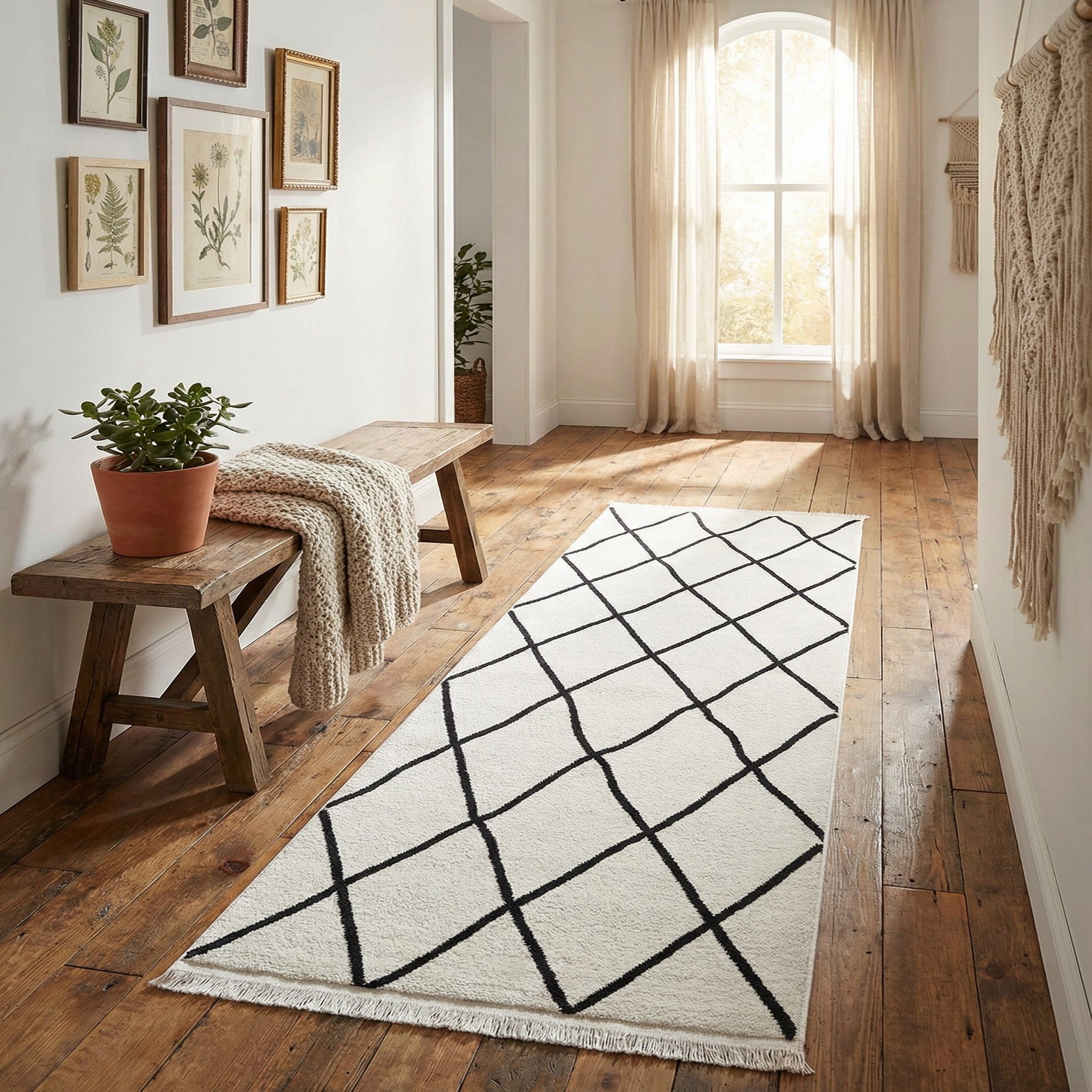 • White bouclĂ© entryway settee
