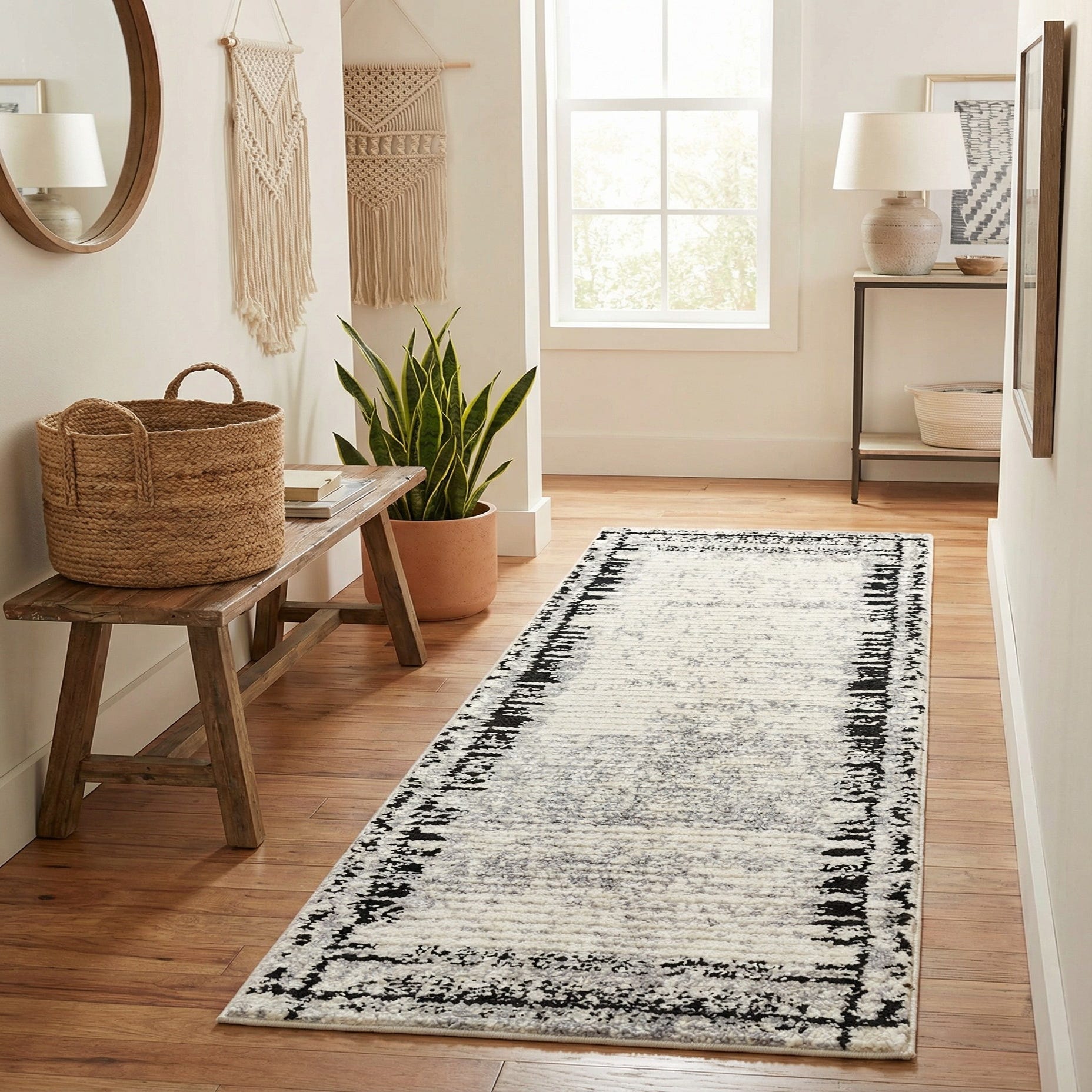 Primary color is Black and White. Colors in this rug include: Black and White, Gray.