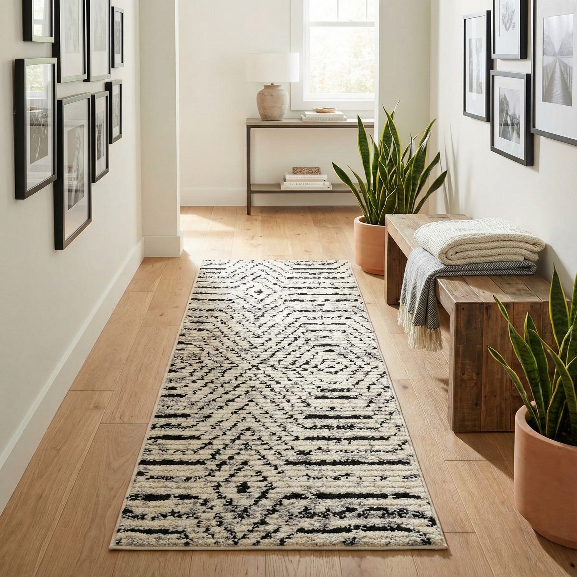 Primary color is Black and White. Colors in this rug include: Black and White, Gray.