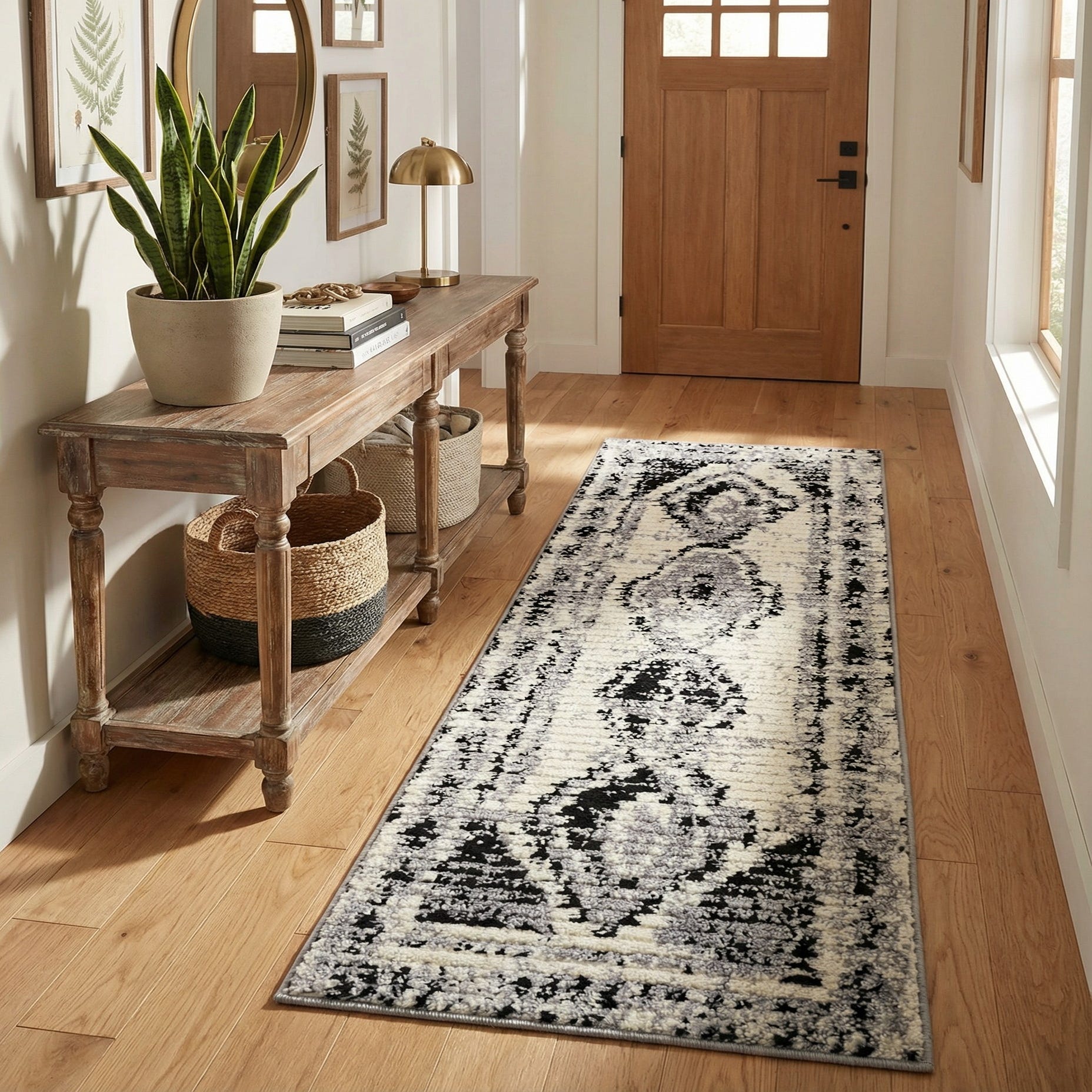 Primary color is Black and White. Colors in this rug include: Black and White, Gray.