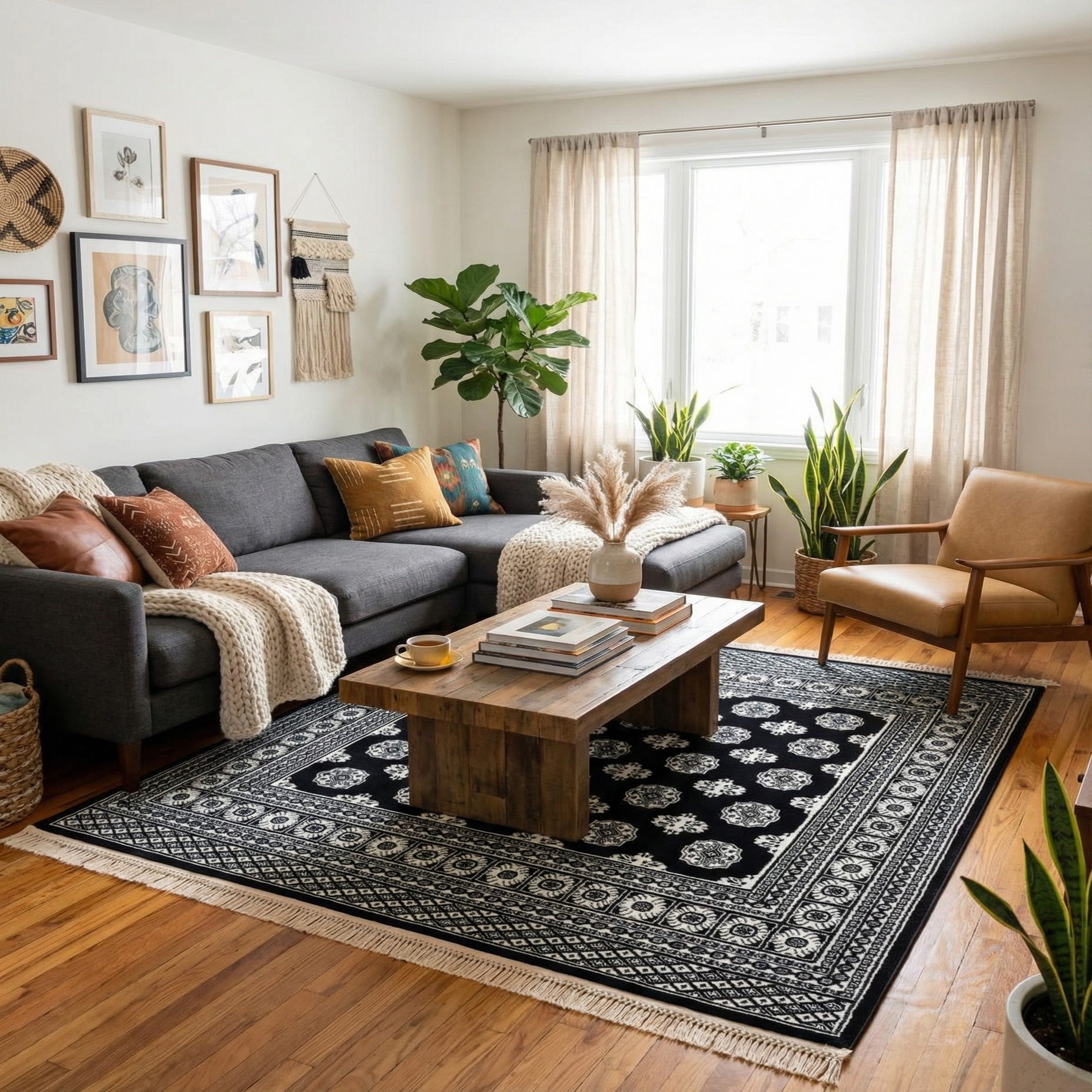 Primary color is Black and White. Colors in this rug include: Black and White, Ivory.