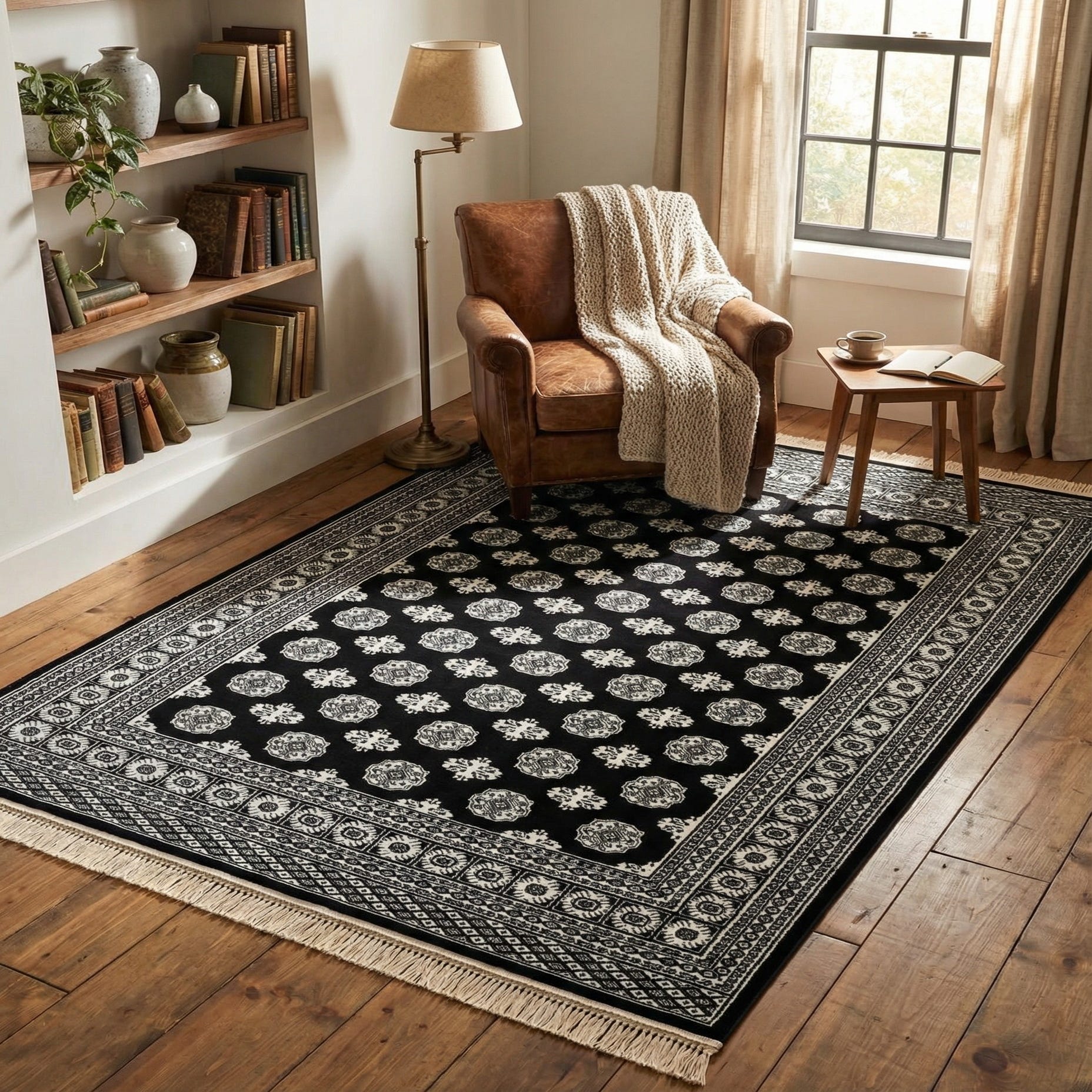 Primary color is Black and White. Colors in this rug include: Black and White, Ivory.