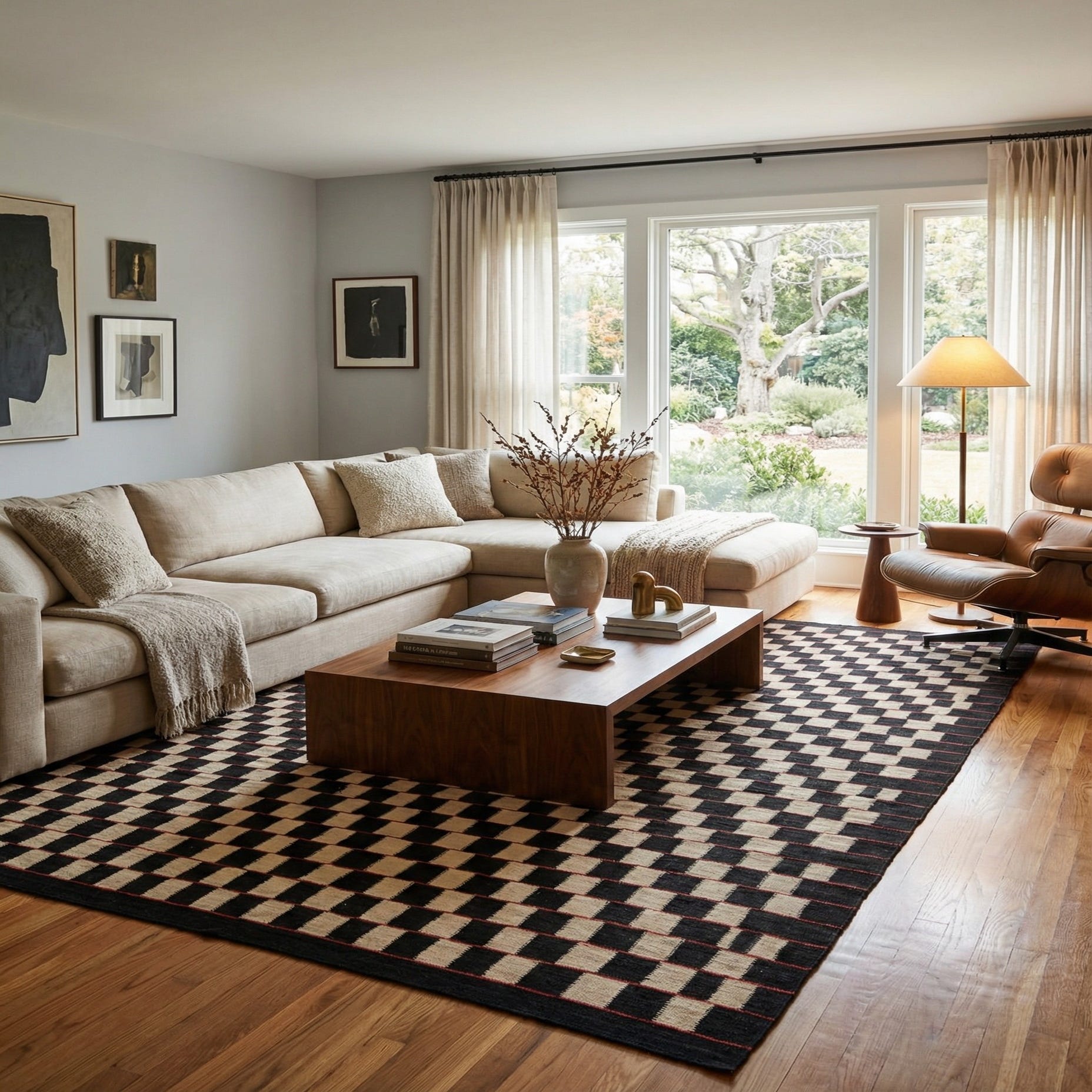 Primary color is Black and White. Colors in this rug include: Black and White, Red.