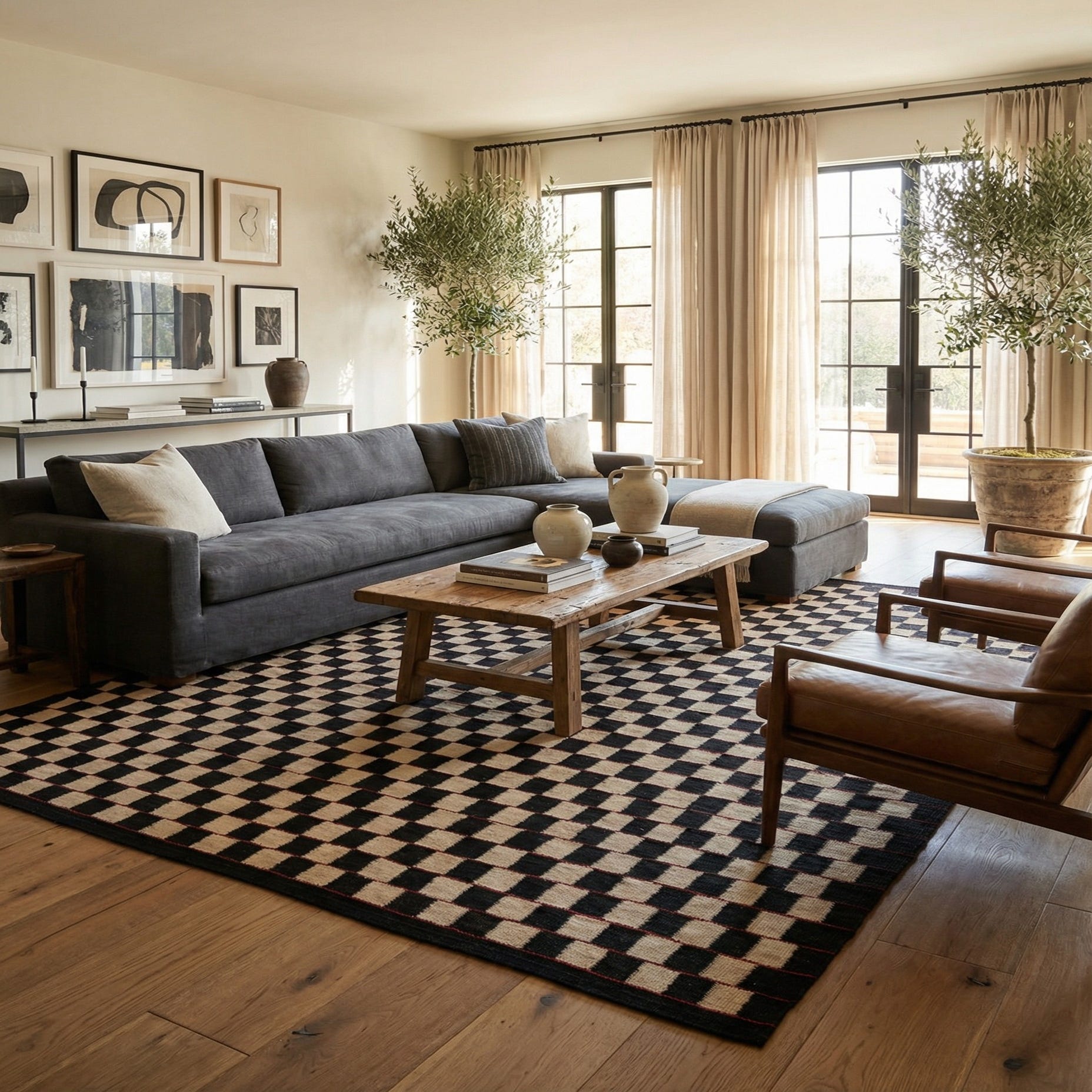 Primary color is Black and White. Colors in this rug include: Black and White, Red.