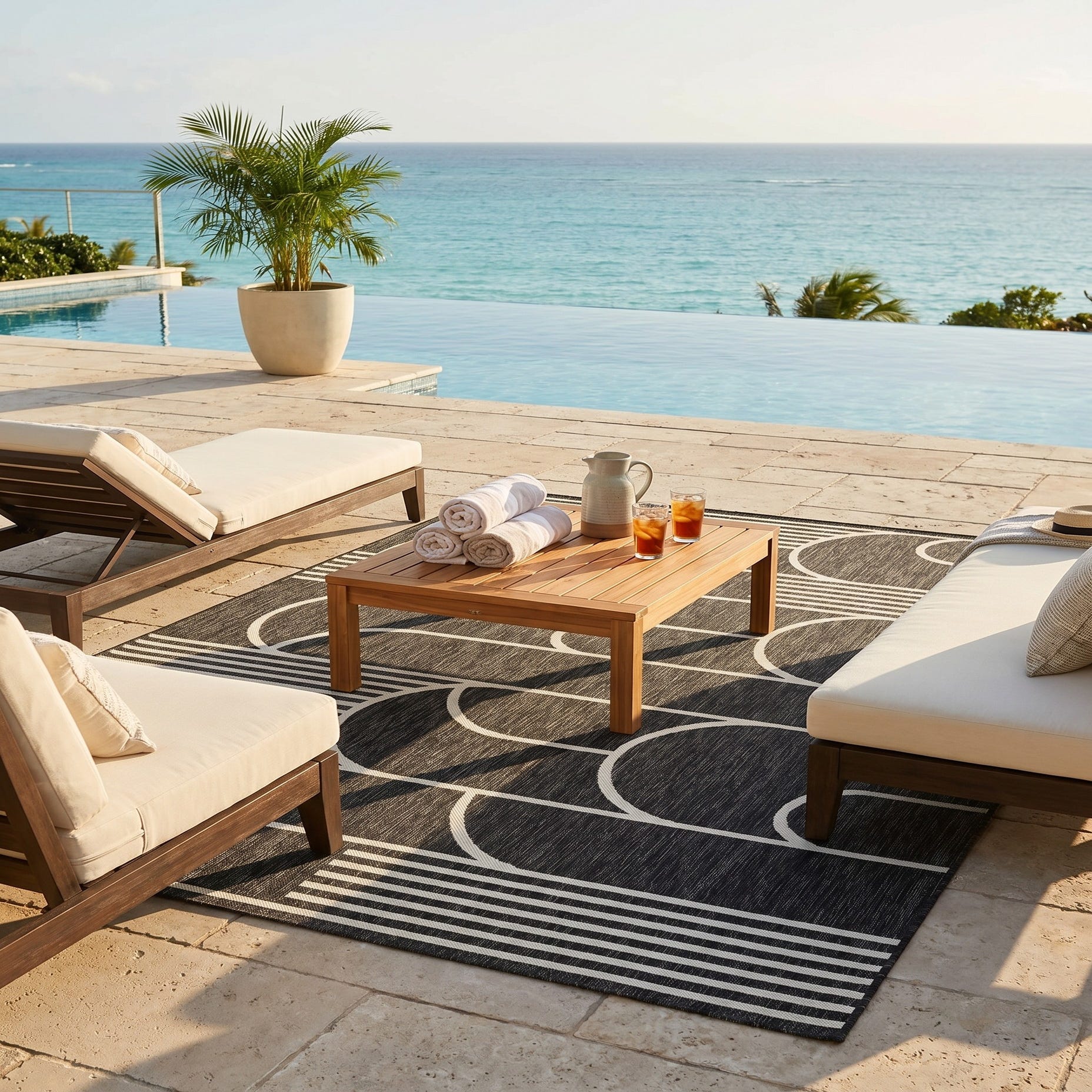 Love the contemporary look of this rug! We are so happy we chose this to accent the blue of our pool with our living area on our lanai. We still are going to add a few more pillows but love the rug to add color.