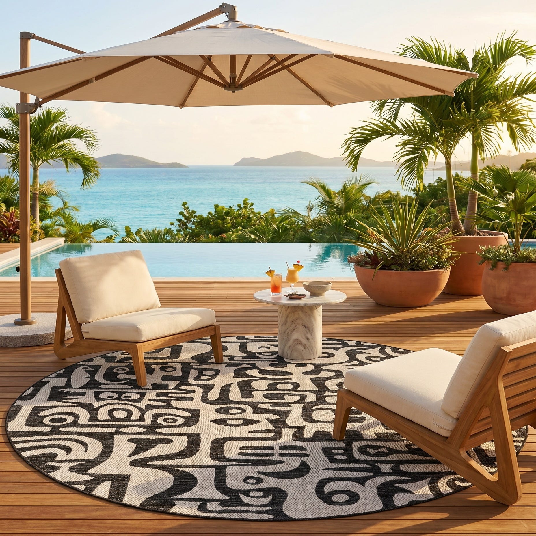 Love the contemporary look of this rug! We are so happy we chose this to accent the blue of our pool with our living area on our lanai. We still are going to add a few more pillows but love the rug to add color.
