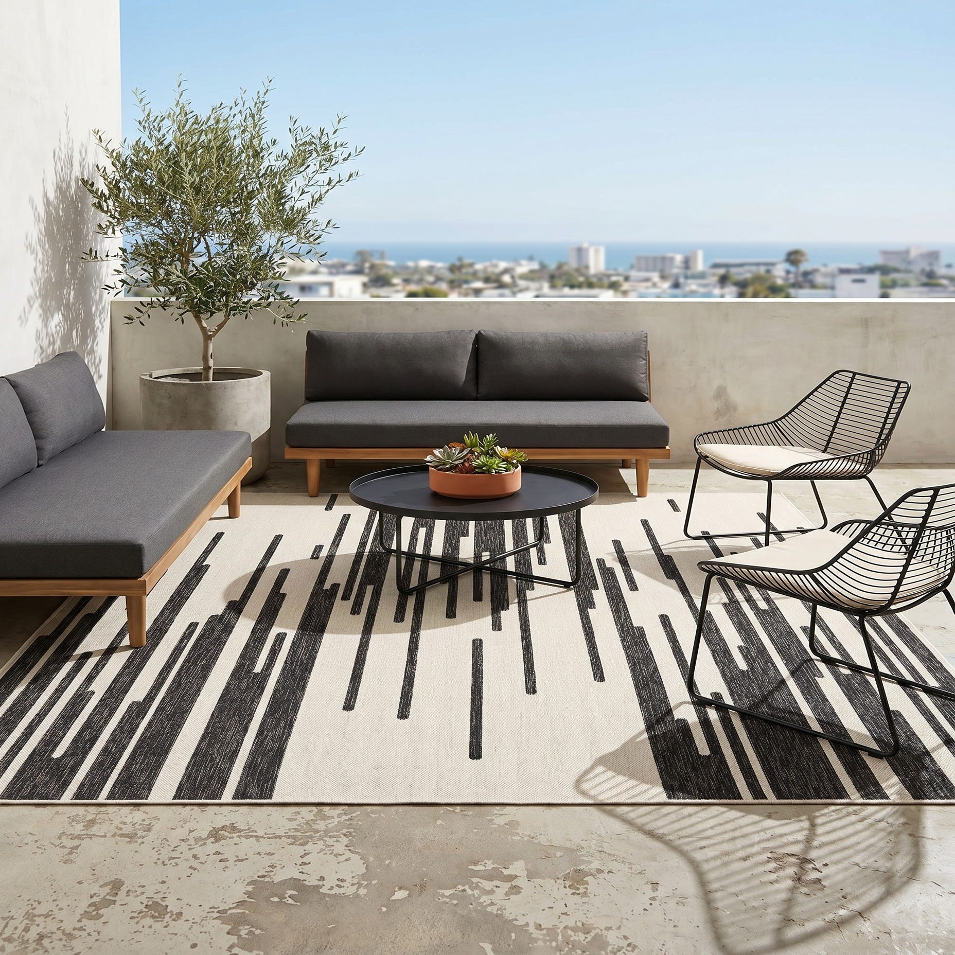 Love the contemporary look of this rug! We are so happy we chose this to accent the blue of our pool with our living area on our lanai. We still are going to add a few more pillows but love the rug to add color.