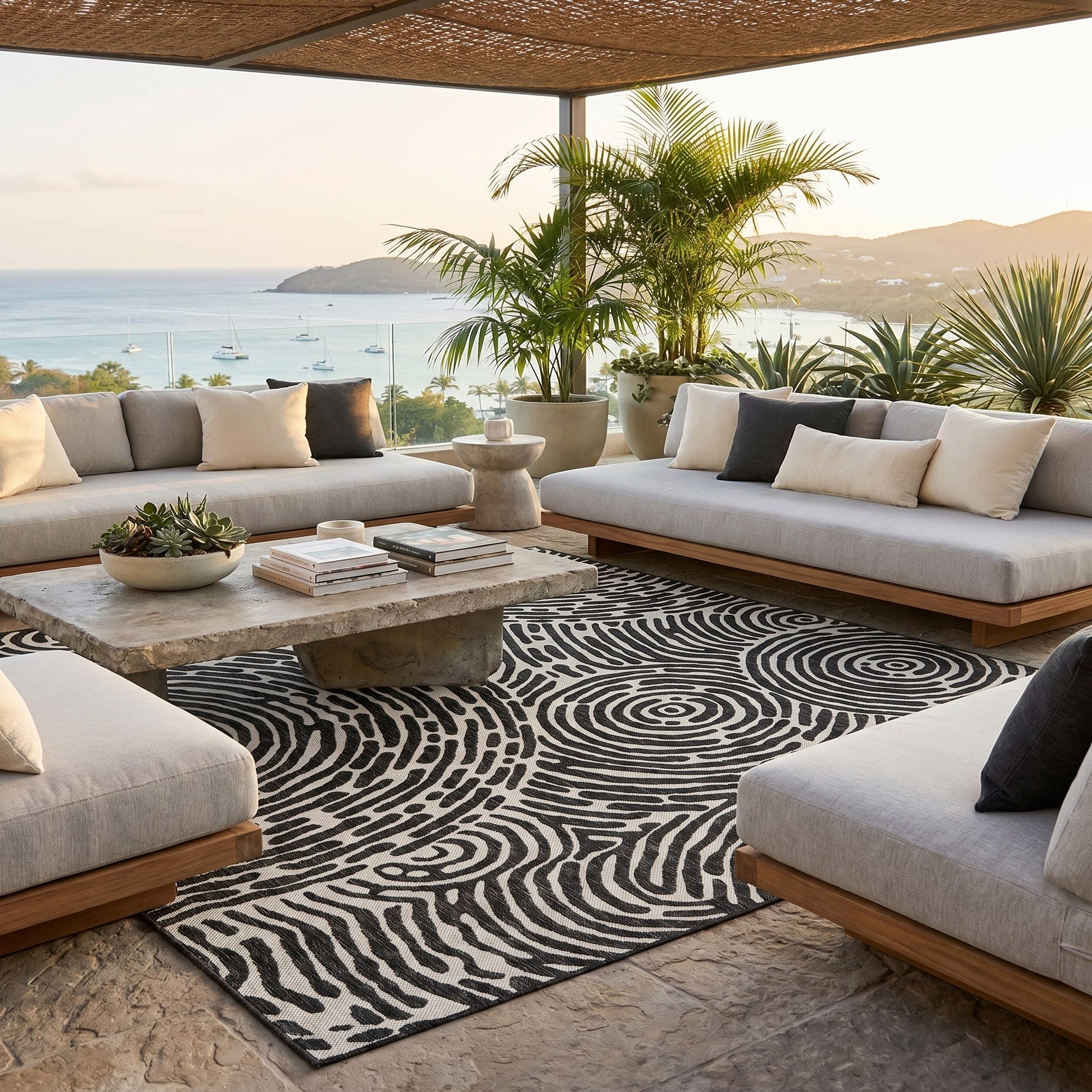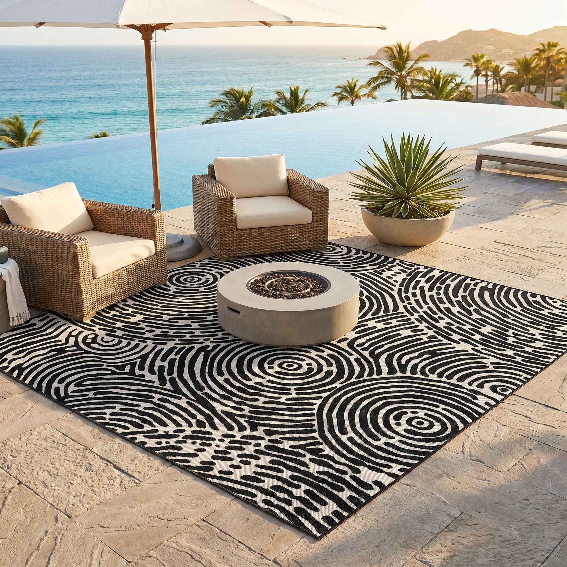 Love the contemporary look of this rug! We are so happy we chose this to accent the blue of our pool with our living area on our lanai. We still are going to add a few more pillows but love the rug to add color.