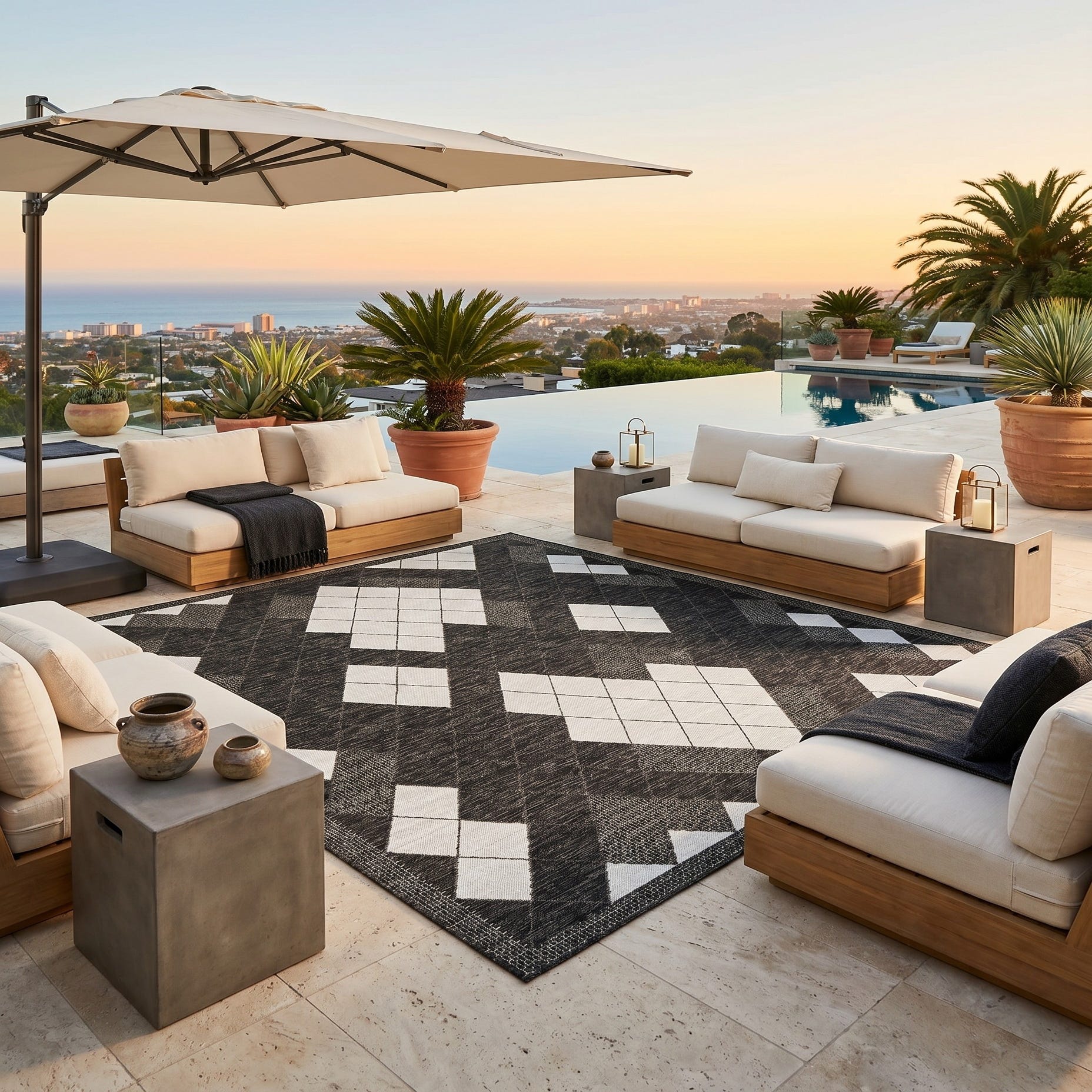 Love the contemporary look of this rug! We are so happy we chose this to accent the blue of our pool with our living area on our lanai. We still are going to add a few more pillows but love the rug to add color.