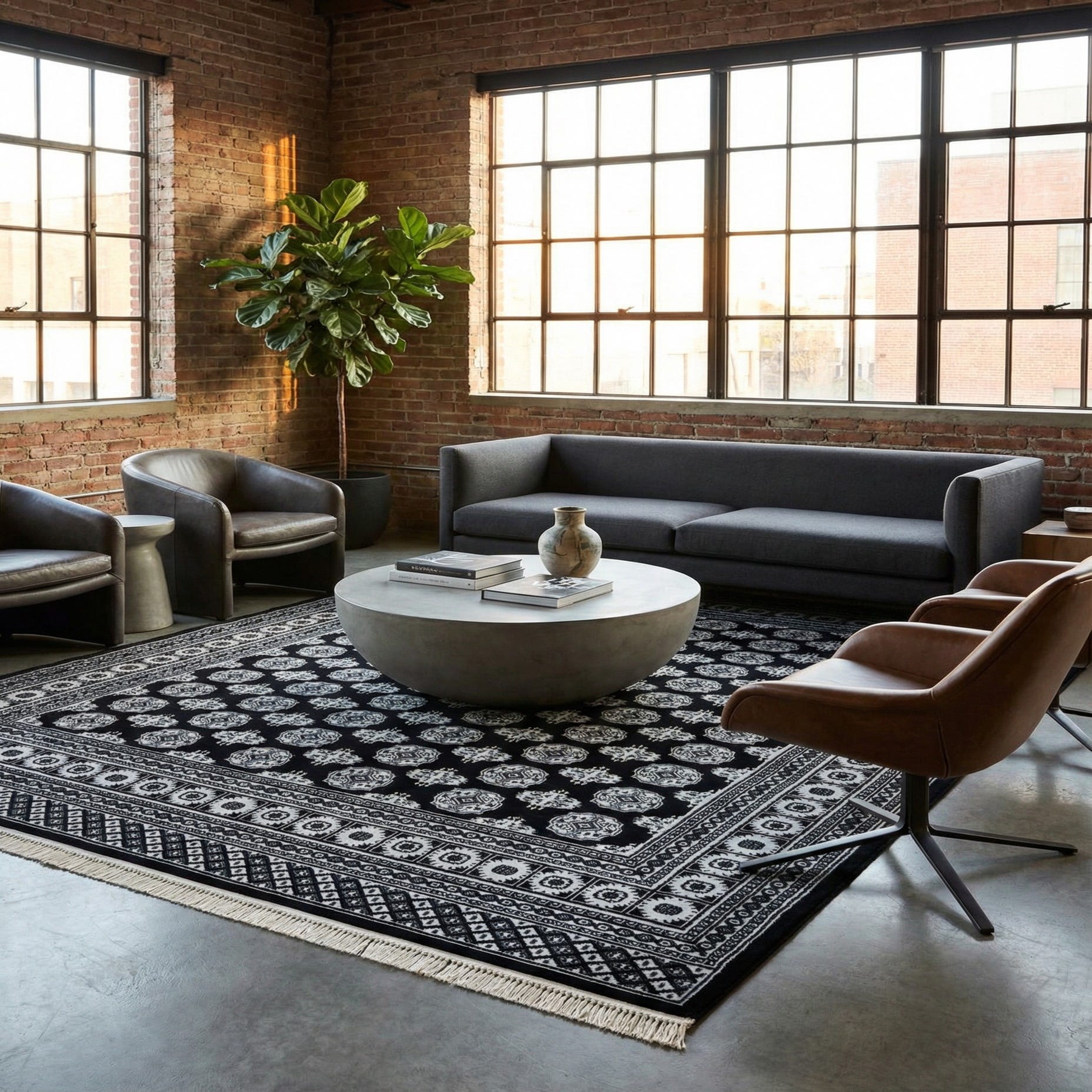 Primary color is Black and White. Colors in this rug include: Black and White, Ivory.