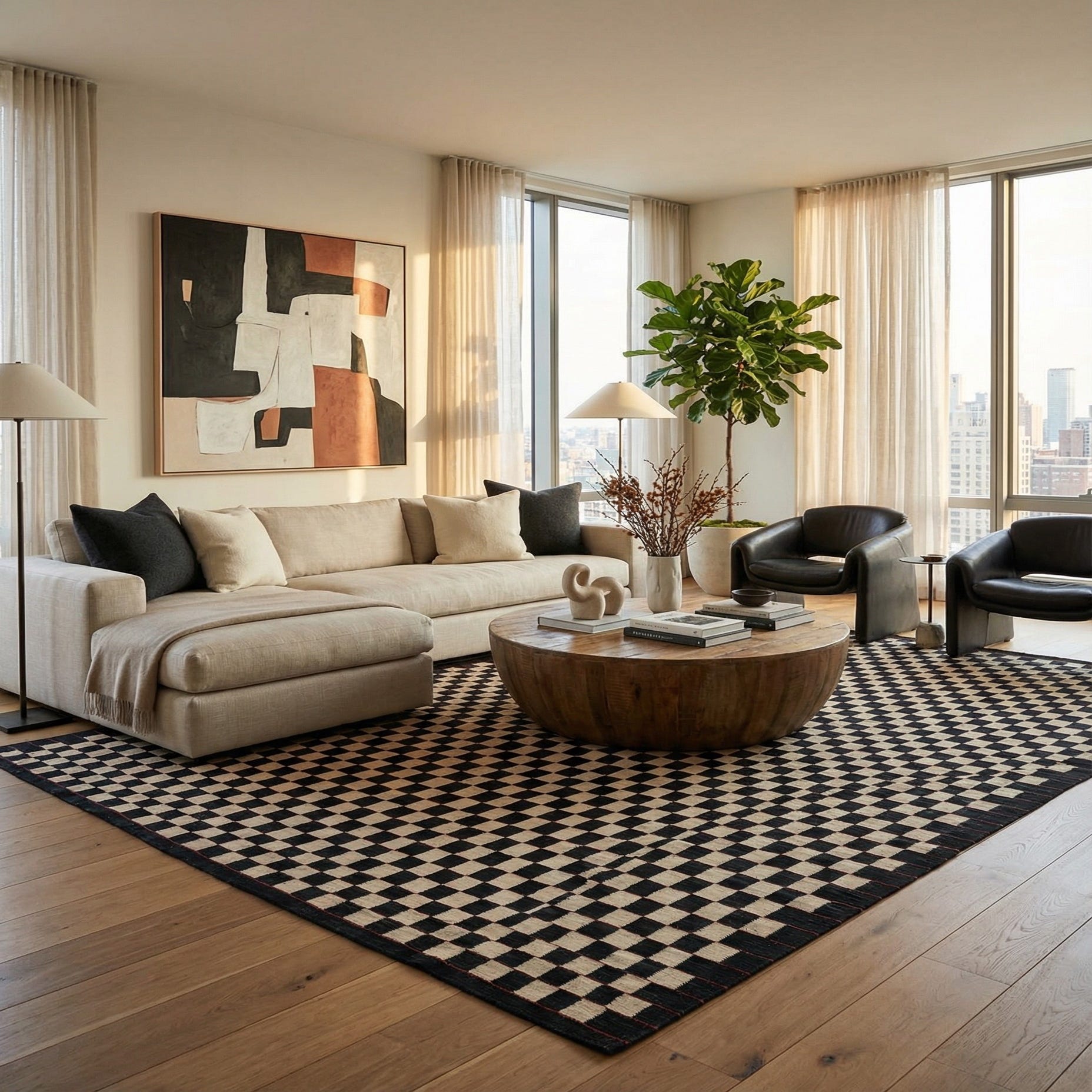 Primary color is Black and White. Colors in this rug include: Black and White, Red.