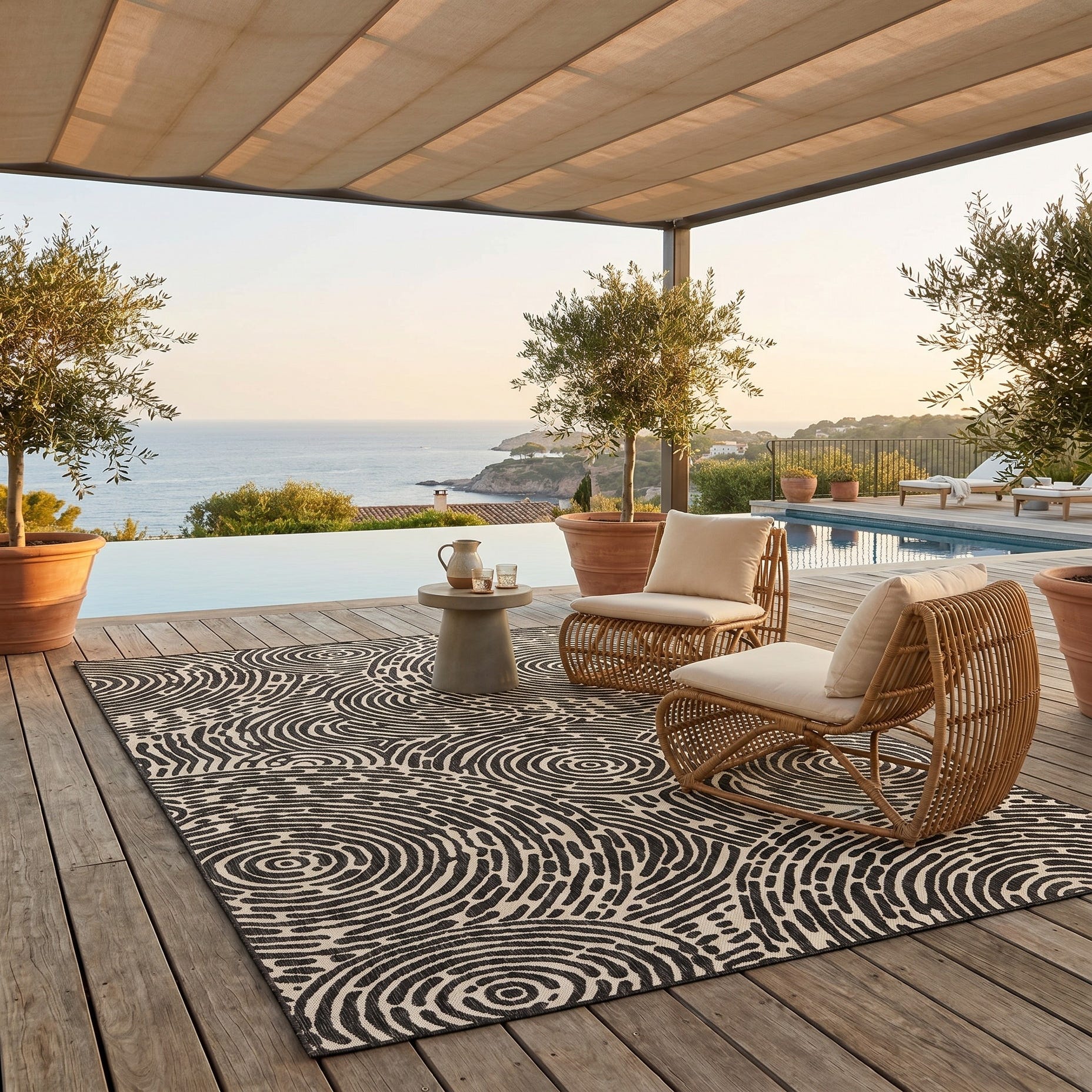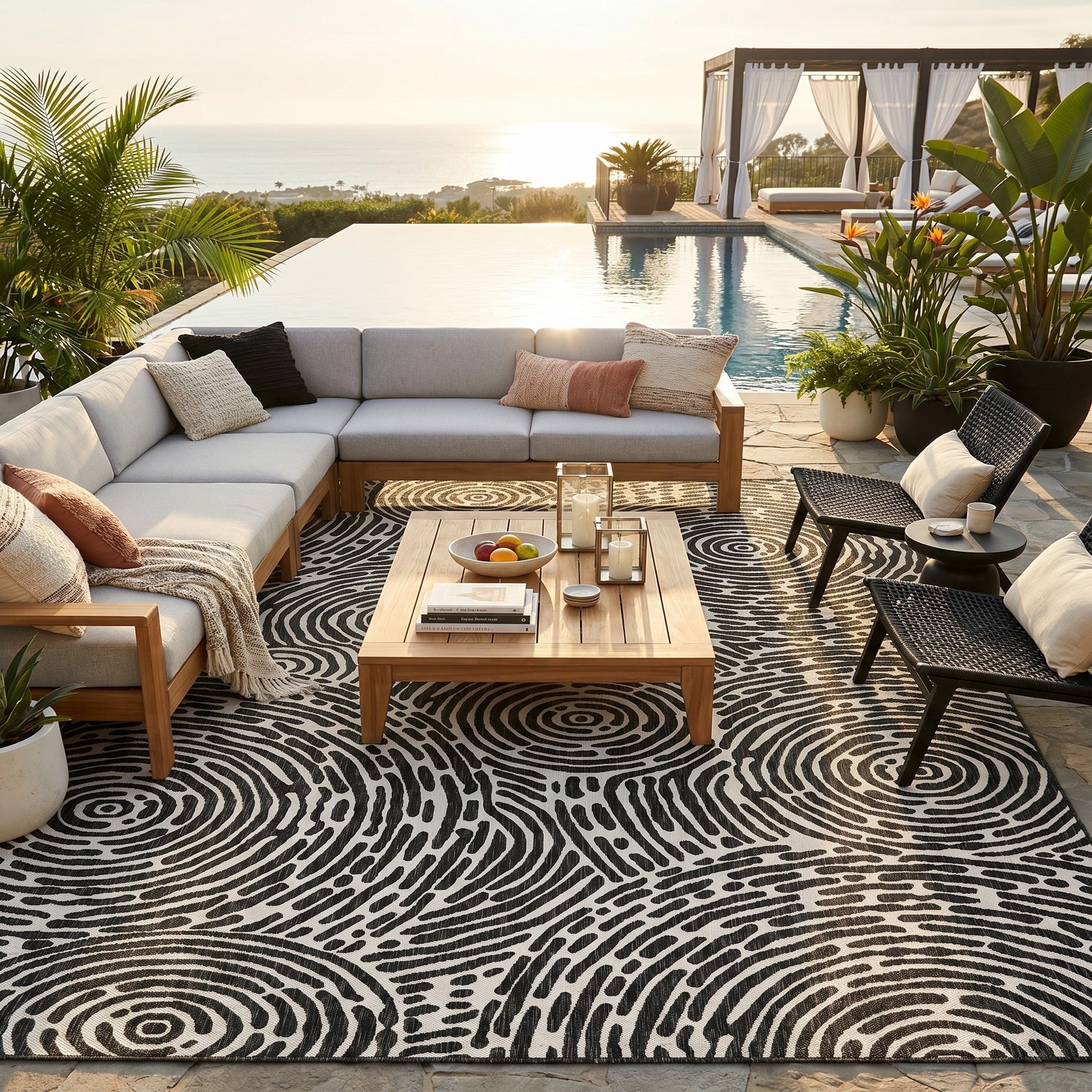 Love the contemporary look of this rug! We are so happy we chose this to accent the blue of our pool with our living area on our lanai. We still are going to add a few more pillows but love the rug to add color.