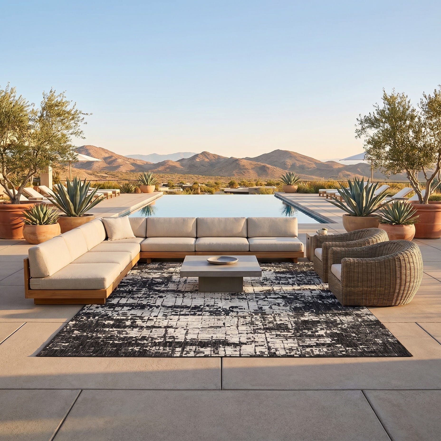 Love the contemporary look of this rug! We are so happy we chose this to accent the blue of our pool with our living area on our lanai. We still are going to add a few more pillows but love the rug to add color.