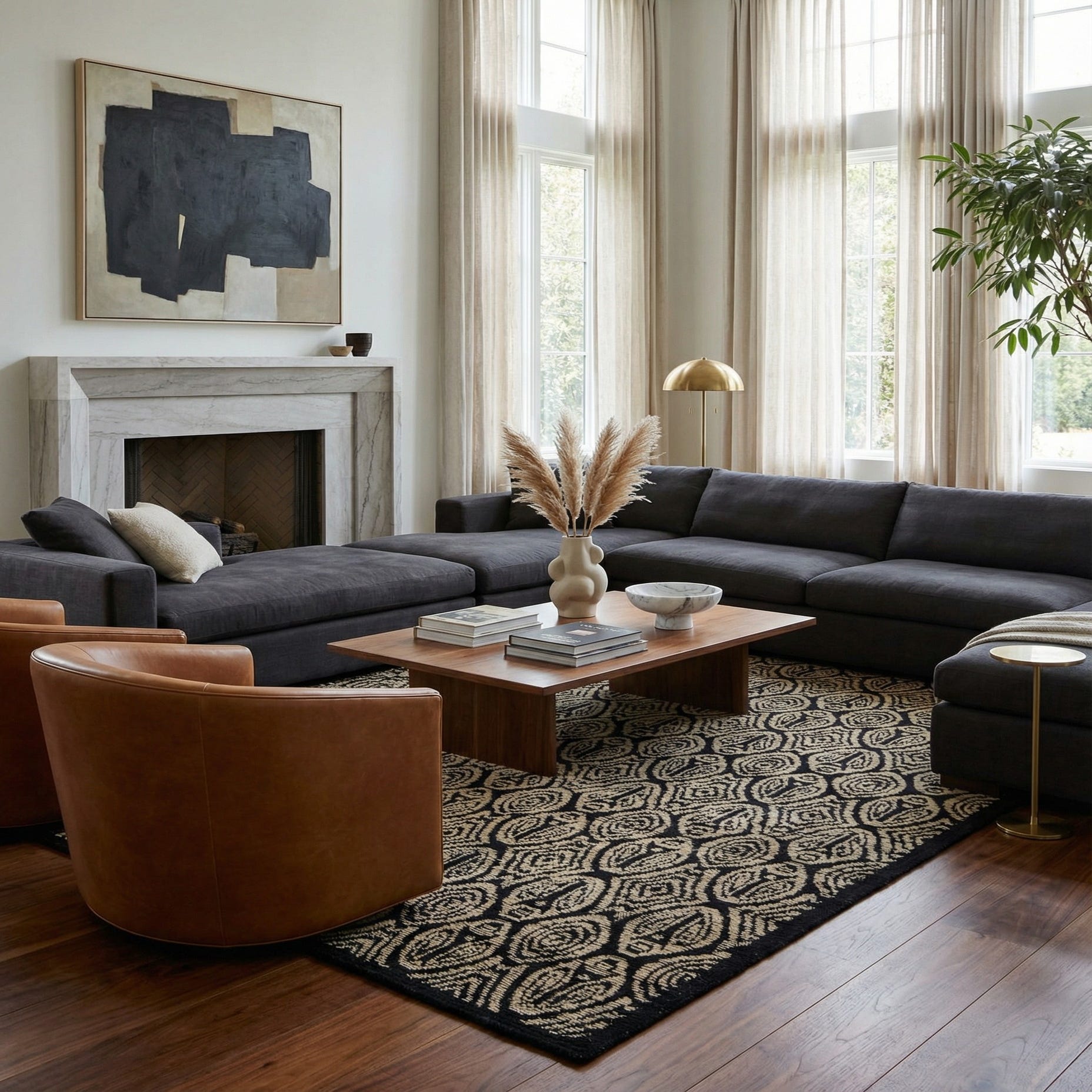 Primary color is Black Beige. Colors in this rug include: Black Beige, Ivory.