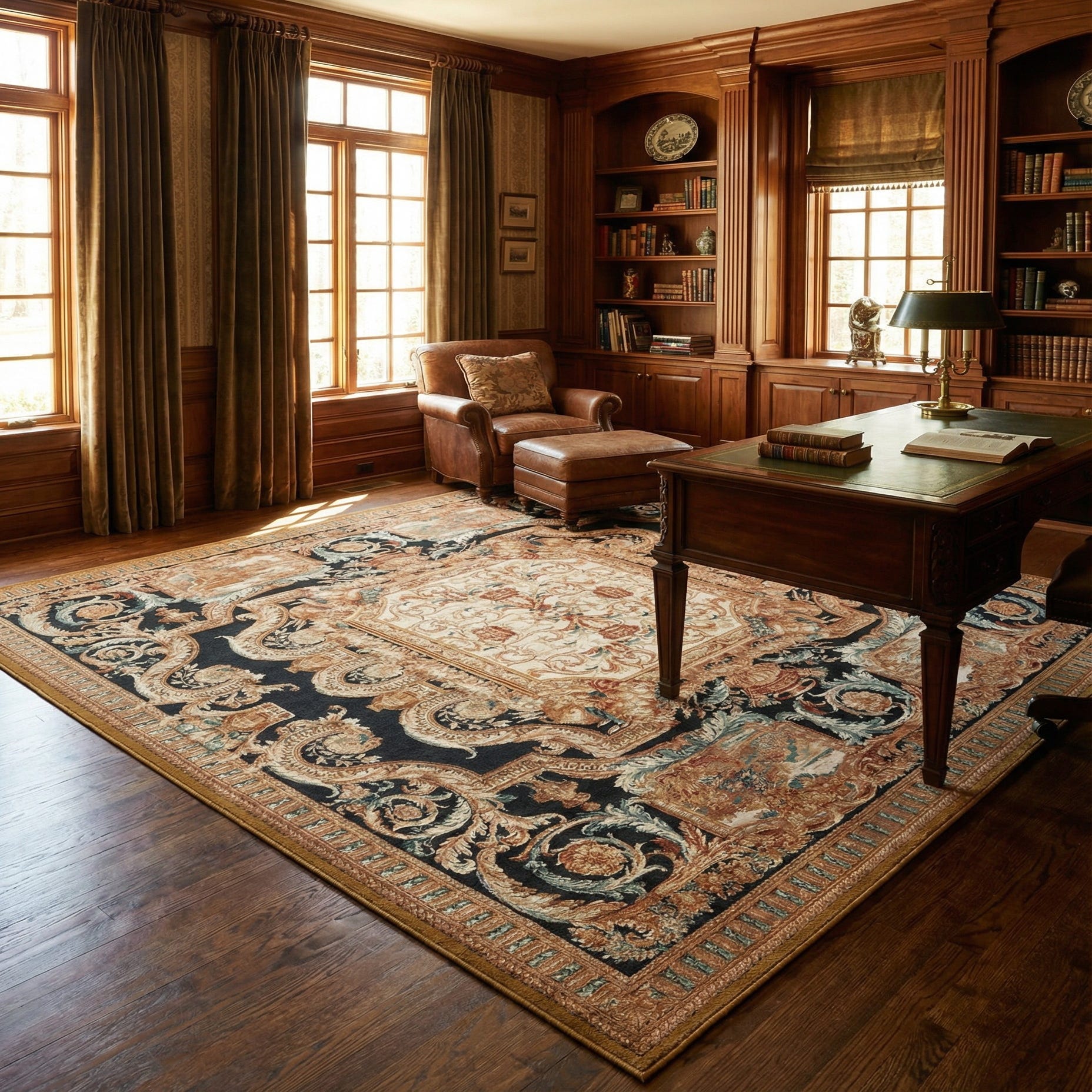Primary color is Black Gold Brown. Colors in this rug include: Black Gold Brown, Beige, Black, Blue, Brown, Red, Navy Blue.