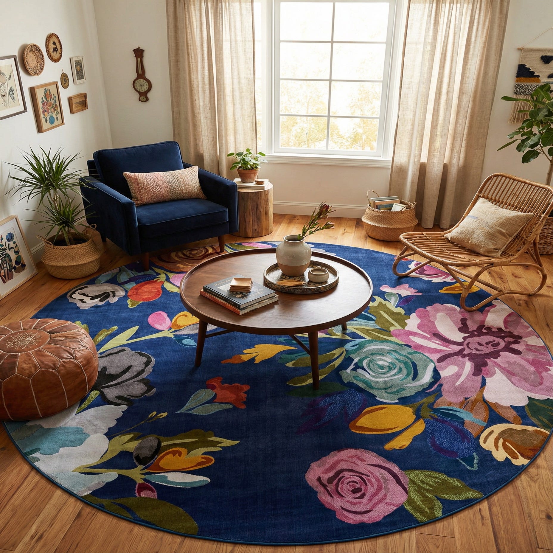 Primary color is Blue. Colors in this rug include: Blue, Black, Gray, Green, Light Blue, Olive, Yellow, Pink, Rust Red.