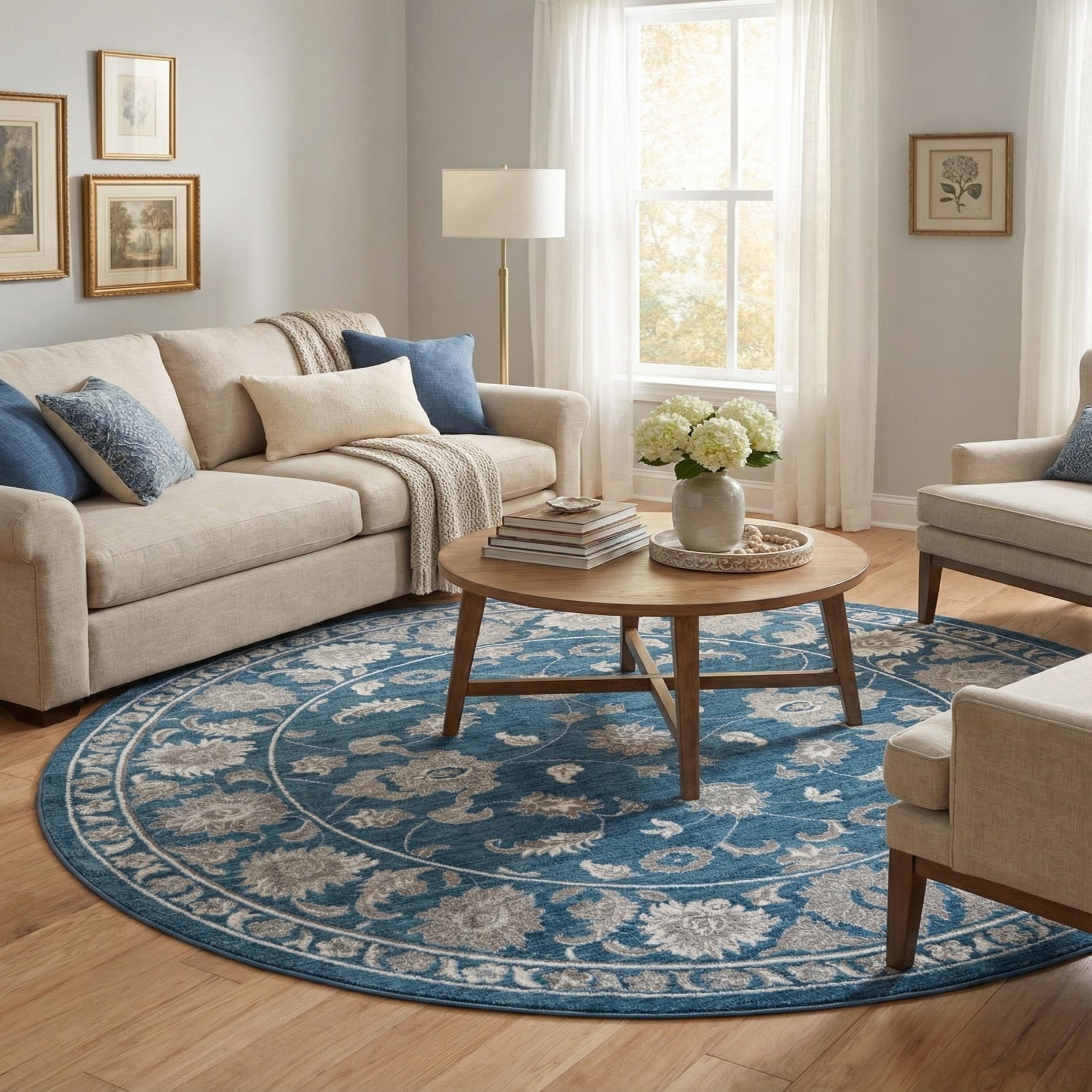 Primary color is Blue. Colors in this rug include: Blue, Gray, Ivory.