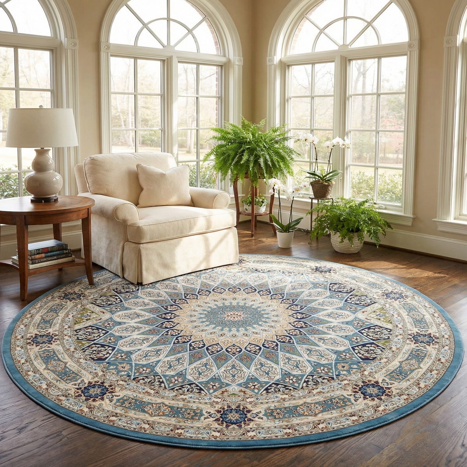 Primary color is Blue. Colors in this rug include: Blue, Burgundy, Cream, Ivory, Light Blue, Light Green, Navy Blue, Puce.